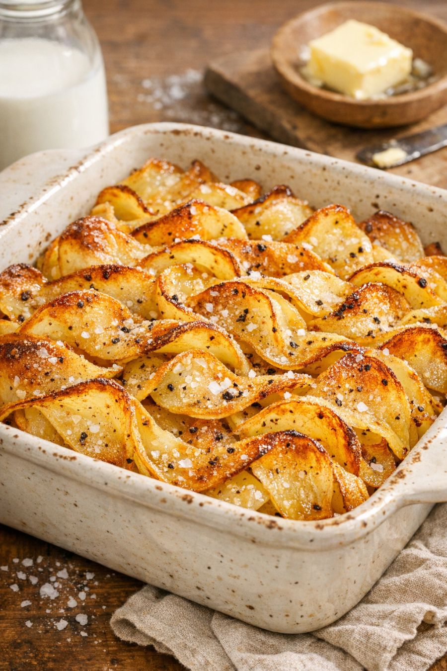 Let the potato ribbons rest for about 10 minutes after coming out of the oven. This helps the creamy milk and butter settle and soak into the potatoes so each scoop holds together better. Taste and add a pinch more salt at the table if needed. Serve warm, straight from the ceramic baking dish.