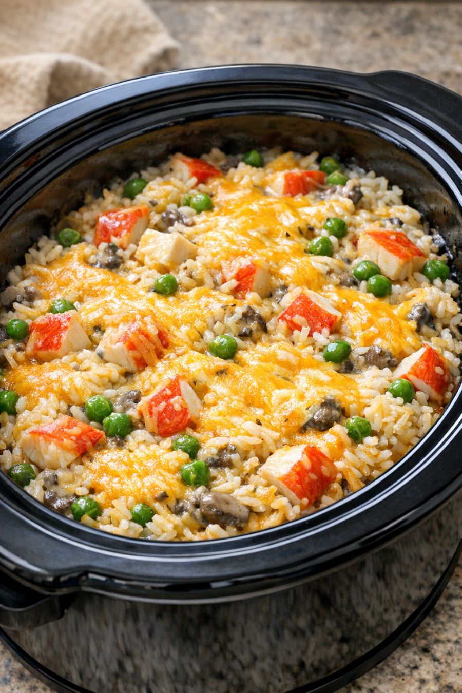 For picky eaters, you can use cream of chicken or cream of celery soup instead of cream of mushroom for a milder flavor. If your family likes extra cheesiness, sprinkle an additional 1/2 cup of shredded cheese over the top during the last 15 minutes of cooking, then cover again so it melts. For a bit of color and nutrition, you can stir in 1 cup of frozen peas or corn during the last 30 minutes; they’ll cook through without getting mushy. If your crew enjoys a little kick, add a pinch of red pepper flakes or a few dashes of hot sauce to the soup mixture before pouring it over the crab. To make it feel more like a classic Midwestern “bake,” you can transfer the finished casserole to an oven-safe dish, top with crushed buttery crackers, and broil for 2 to 3 minutes until golden and crisp. Food safety tips: Always start with fully frozen imitation crab kept at a safe freezer temperature (0°F / -18°C or below) until you’re ready to cook. Use a slow cooker that is at least 4 quarts so the food heats evenly. Cook on LOW as directed, and check that the casserole is piping hot and steamy throughout before serving; the internal temperature in the center should reach at least 165°F (74°C). Do not leave the finished casserole at room temperature for more than 2 hours; refrigerate leftovers promptly in shallow containers and use within 3 days, reheating until hot all the way through before eating.