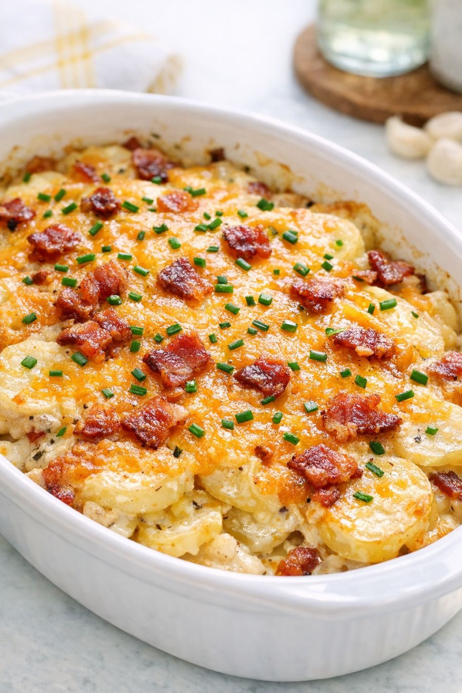 Serve this potato bake hot, straight from the oven, with a simple green vegetable like steamed peas, buttered green beans, or a tossed salad to balance the richness. It pairs nicely with meatloaf, baked ham, roasted chicken, or even pan-fried pork chops. For a true farmhouse-style supper, add a basket of warm dinner rolls or buttered bread on the side, and finish the meal with something simple and old-fashioned, like applesauce or sliced fresh fruit.