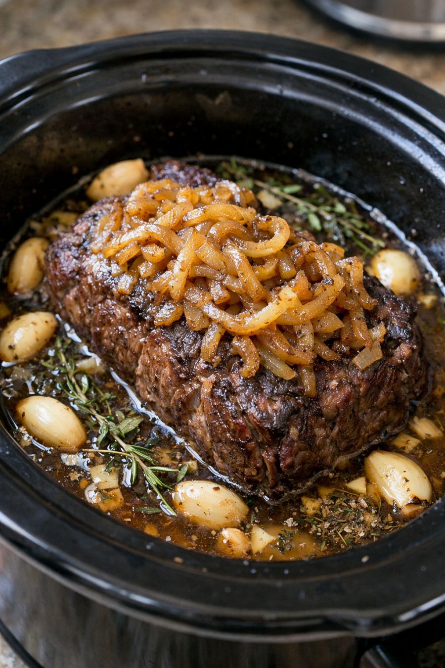 Slice the rested roast against the grain for neat slices, or use two forks to gently shred it into the cooking juices in the slow cooker. Stir the beef with the onions and juices so everything is coated. Taste the sauce and adjust seasoning with a bit more salt and pepper if needed before serving.