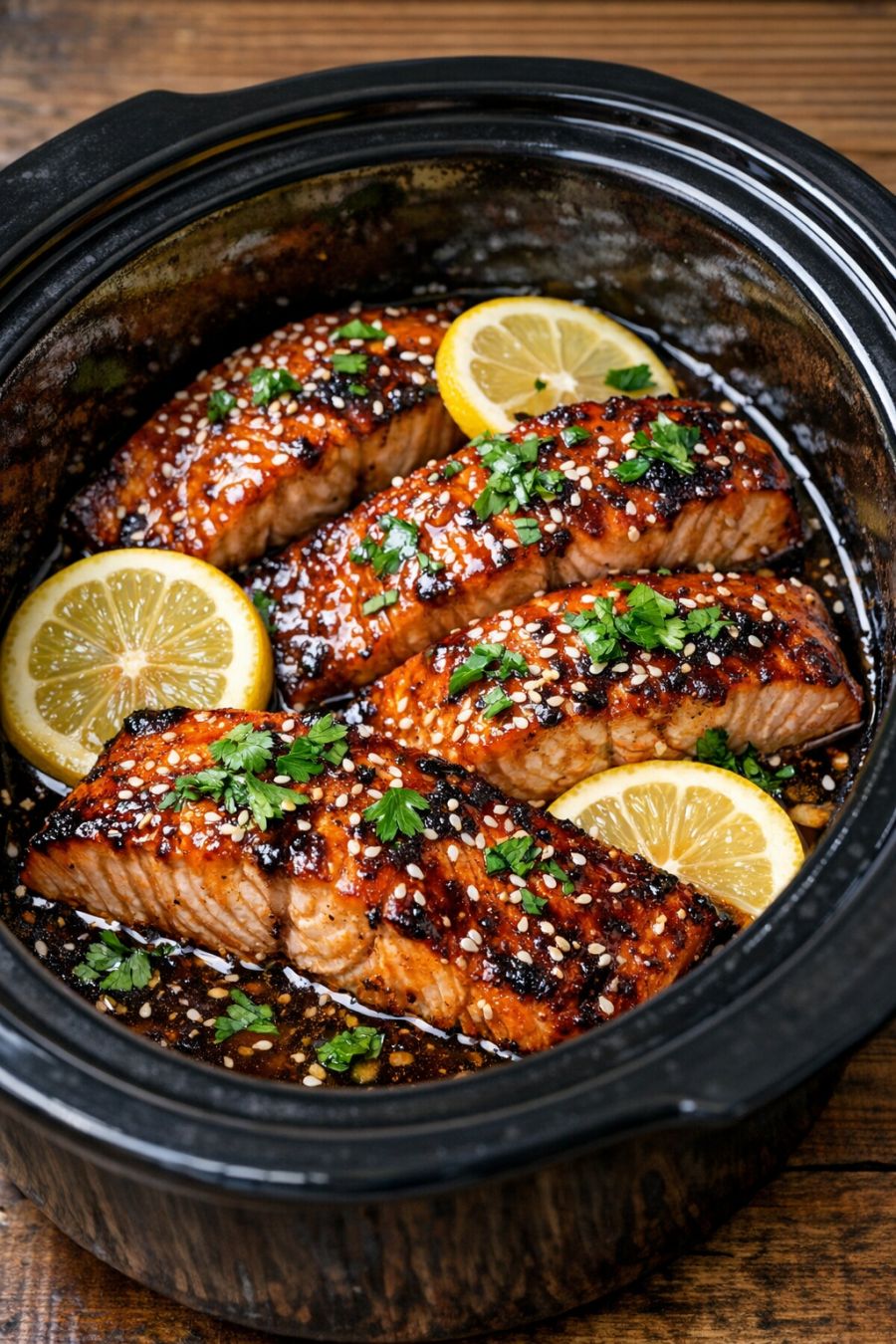 Once the salmon is cooked, carefully lift the fillets out with a spatula, keeping them as intact as possible, and transfer to plates. Spoon some of the warm glaze from the bottom of the slow cooker over the top of each piece for extra flavor and shine.