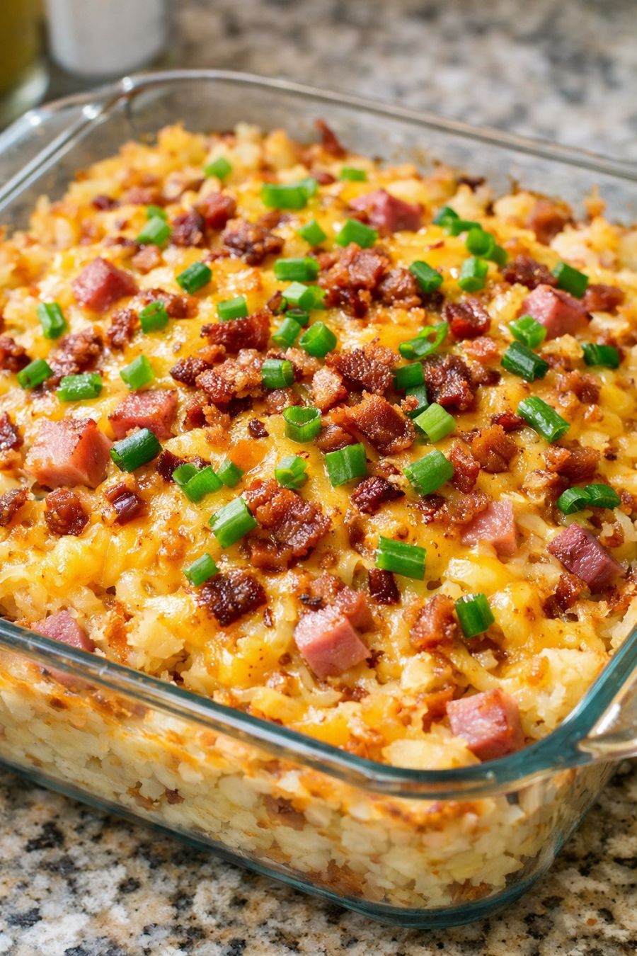 Slice into 6–8 portions and serve warm, scooping down through the layers so each serving includes crisped hash brown patties, ham, and plenty of cheese.