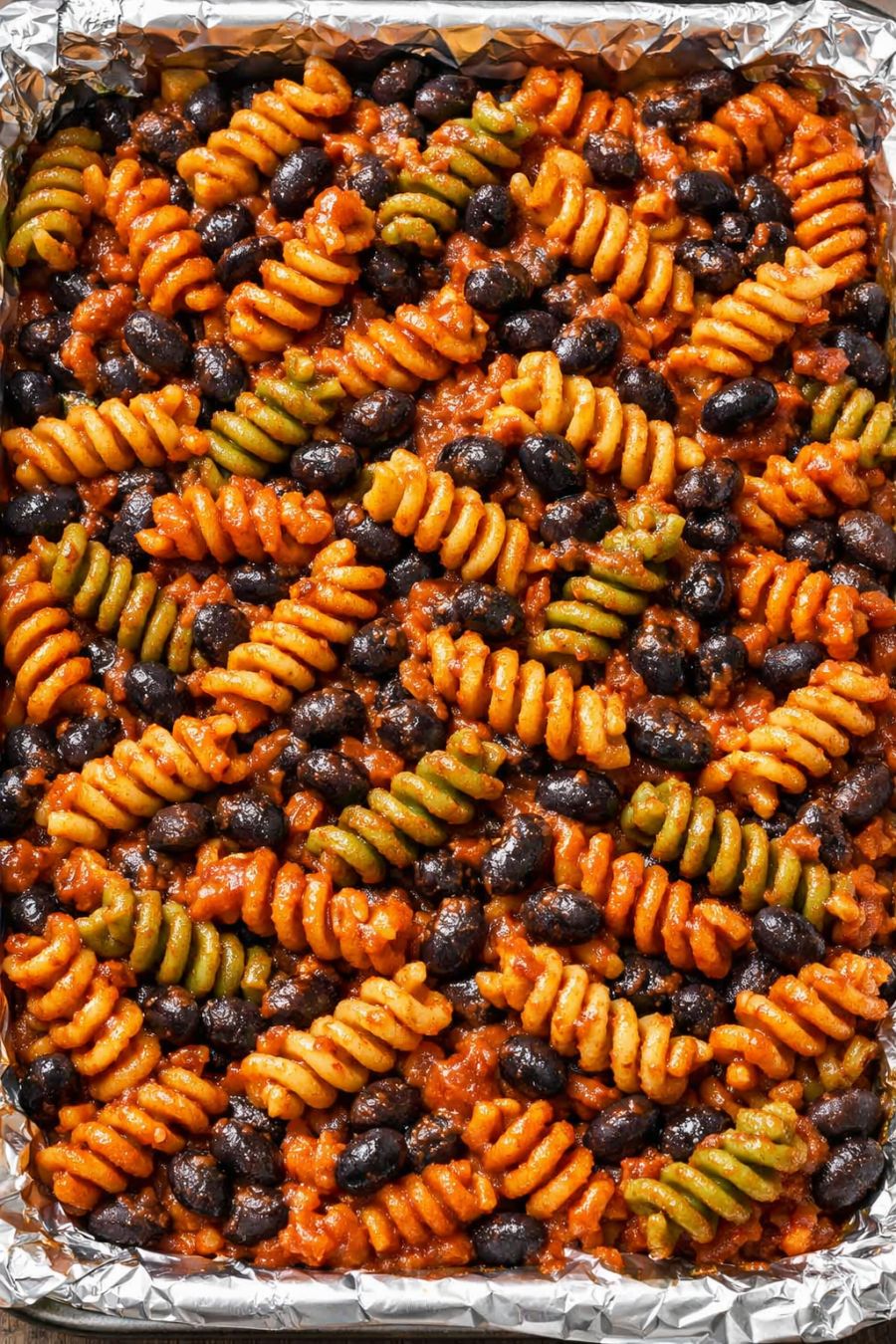 Let the pasta rest on the baking sheet for 5 to 10 minutes before serving. The sauce will continue to thicken as it cools slightly, and the colors of the tricolor rotini will stand out against the dark black beans and red sauce. Spoon into bowls and serve warm.