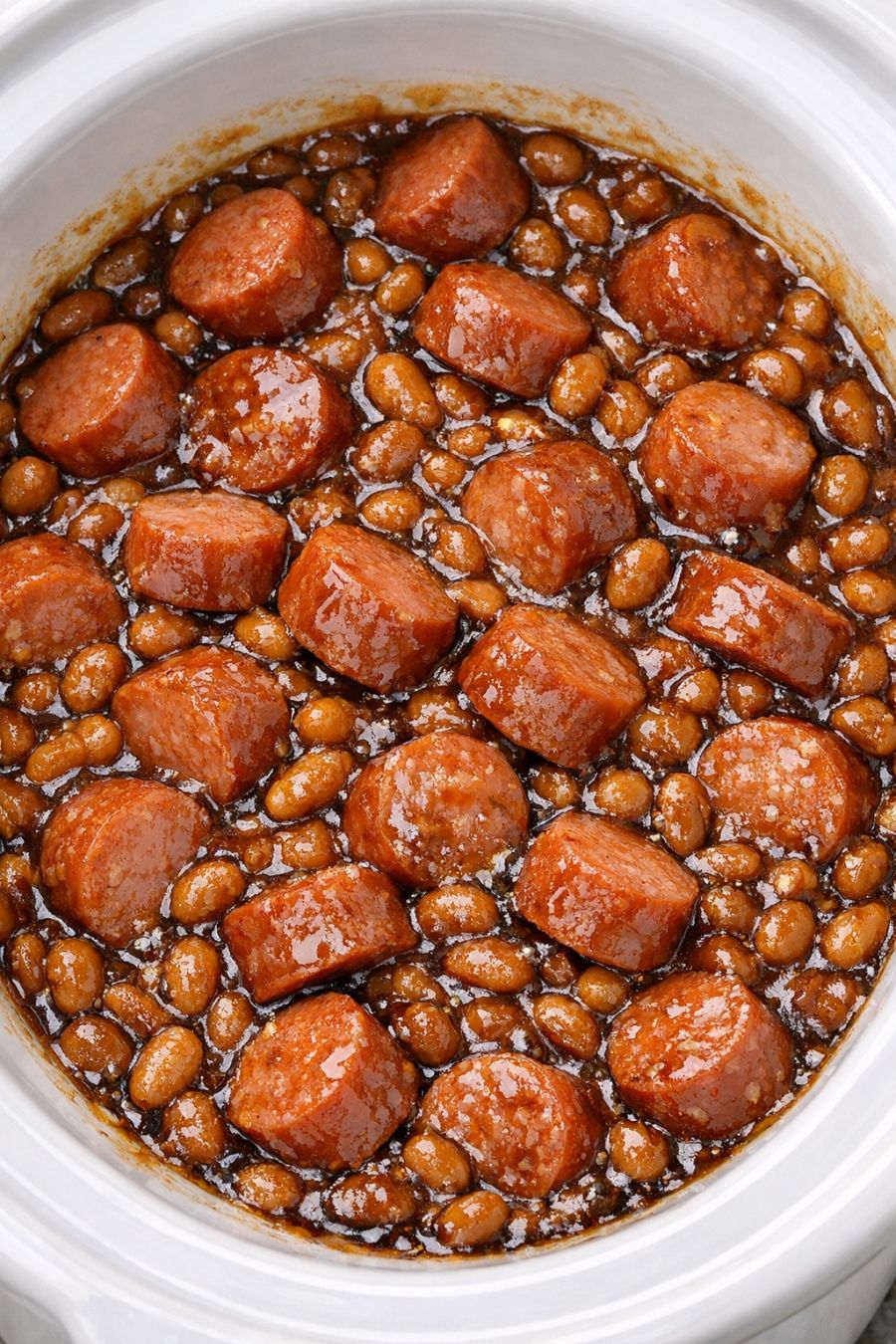 Cover the slow cooker with the lid. Cook on LOW for 4 to 6 hours, or on HIGH for 2 to 3 hours, until the beans are very soft, the hot dogs are plump, and the sauce is bubbling and slightly thickened with a dark molasses shine.