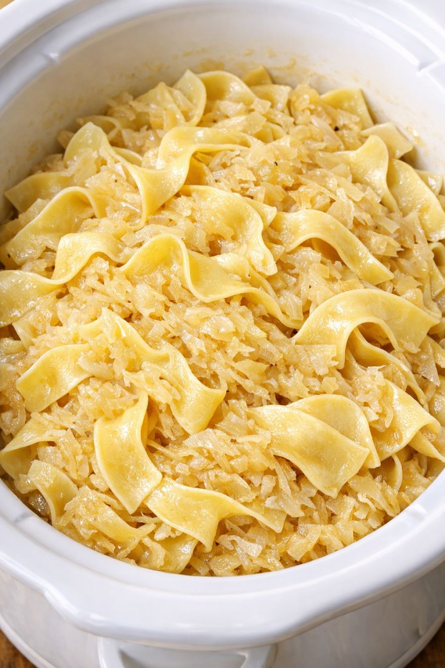 If, near the end of cooking, the noodles look dry before they are fully tender, sprinkle in 2 to 4 tablespoons of hot water, then gently toss again. Continue cooking on LOW, checking every 15 minutes until the noodles are soft and the sauerkraut is silky.