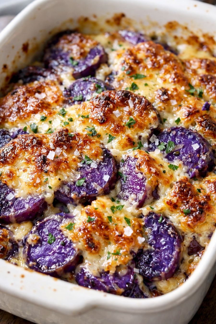 Serve these creamy baked purple potatoes alongside a simple green salad or steamed broccoli to balance the richness, or pair them with roasted chicken, pan-seared pork chops, or baked fish for a complete meal. They’re also lovely as a vegetarian main with a fried or poached egg on top and a side of crusty bread to soak up the sauce. A crisp white wine or unsweetened iced tea works nicely to cut through the creaminess, while a spoonful of tangy sauerkraut or a quick cucumber salad adds a bright counterpoint.