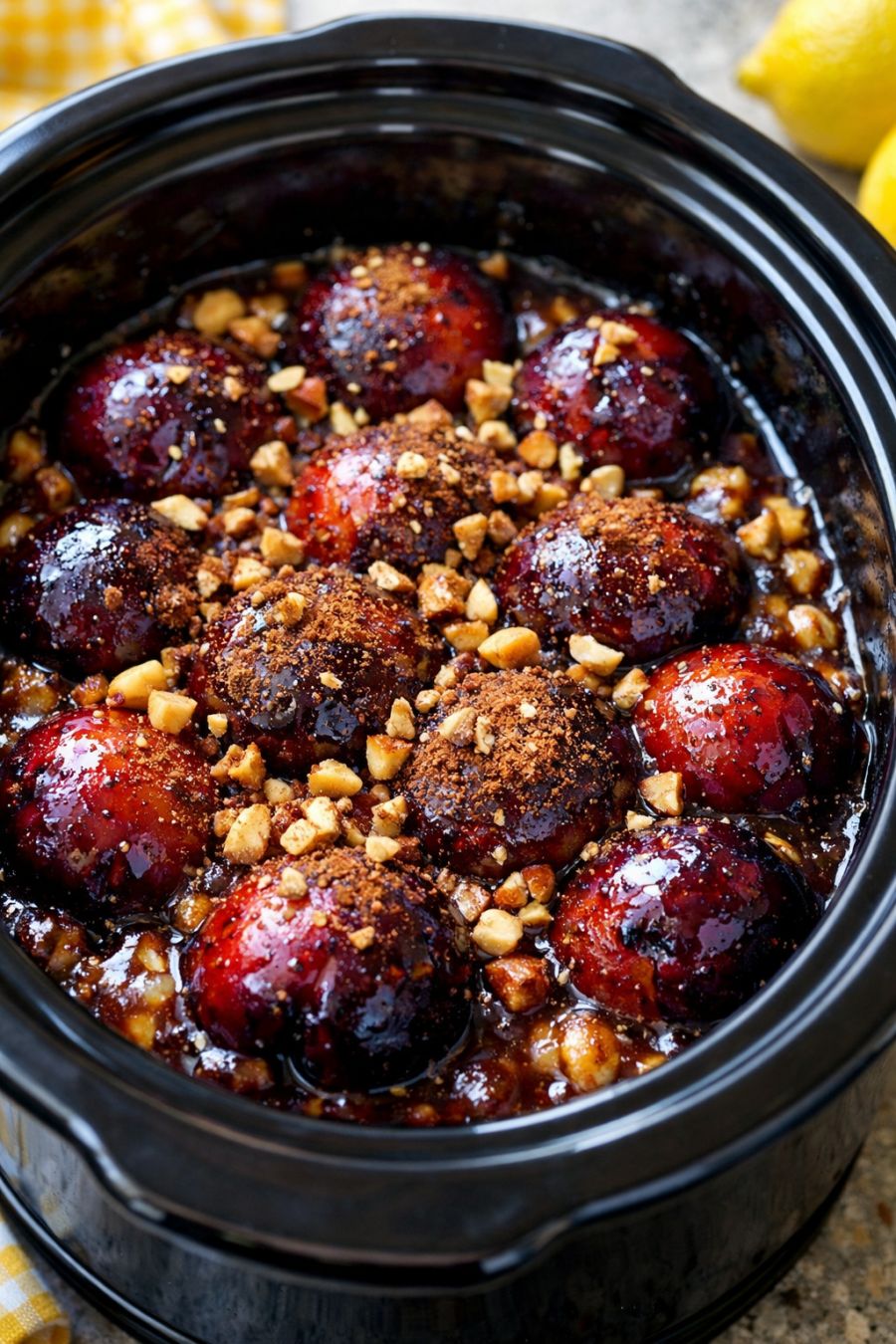 Serve the warm plums and their sauce straight from the slow cooker, spooning over ice cream, yogurt, or cake. Store any leftovers in a covered container in the refrigerator for up to 4 days, reheating gently before serving.