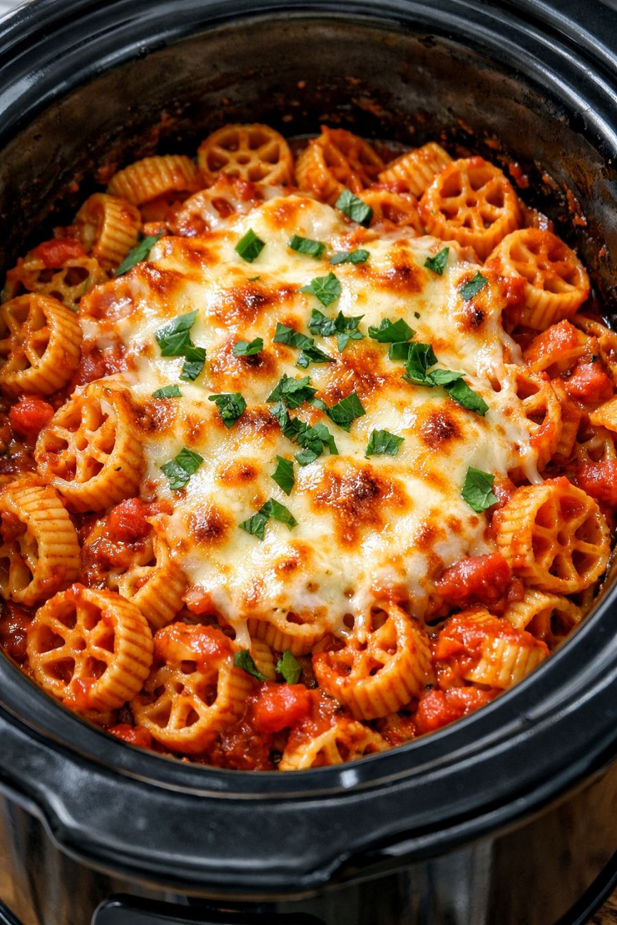 Food safety tips: Make sure the pasta is fully submerged in liquid as much as possible so it cooks evenly and doesn’t dry out or scorch along the edges. Cook on LOW, not WARM, until the pasta is tender; WARM is only for holding food at a safe temperature after it’s done. If you add any cooked meat, be sure it was previously cooked to a safe internal temperature (165°F for poultry, 160°F for ground beef) and cooled properly before storing, and then reheated thoroughly in the slow cooker. Leftovers should be cooled, refrigerated within 2 hours, and eaten within 3–4 days. Reheat leftovers until steaming hot, adding a splash of broth or water if the pasta has thickened too much in the fridge.