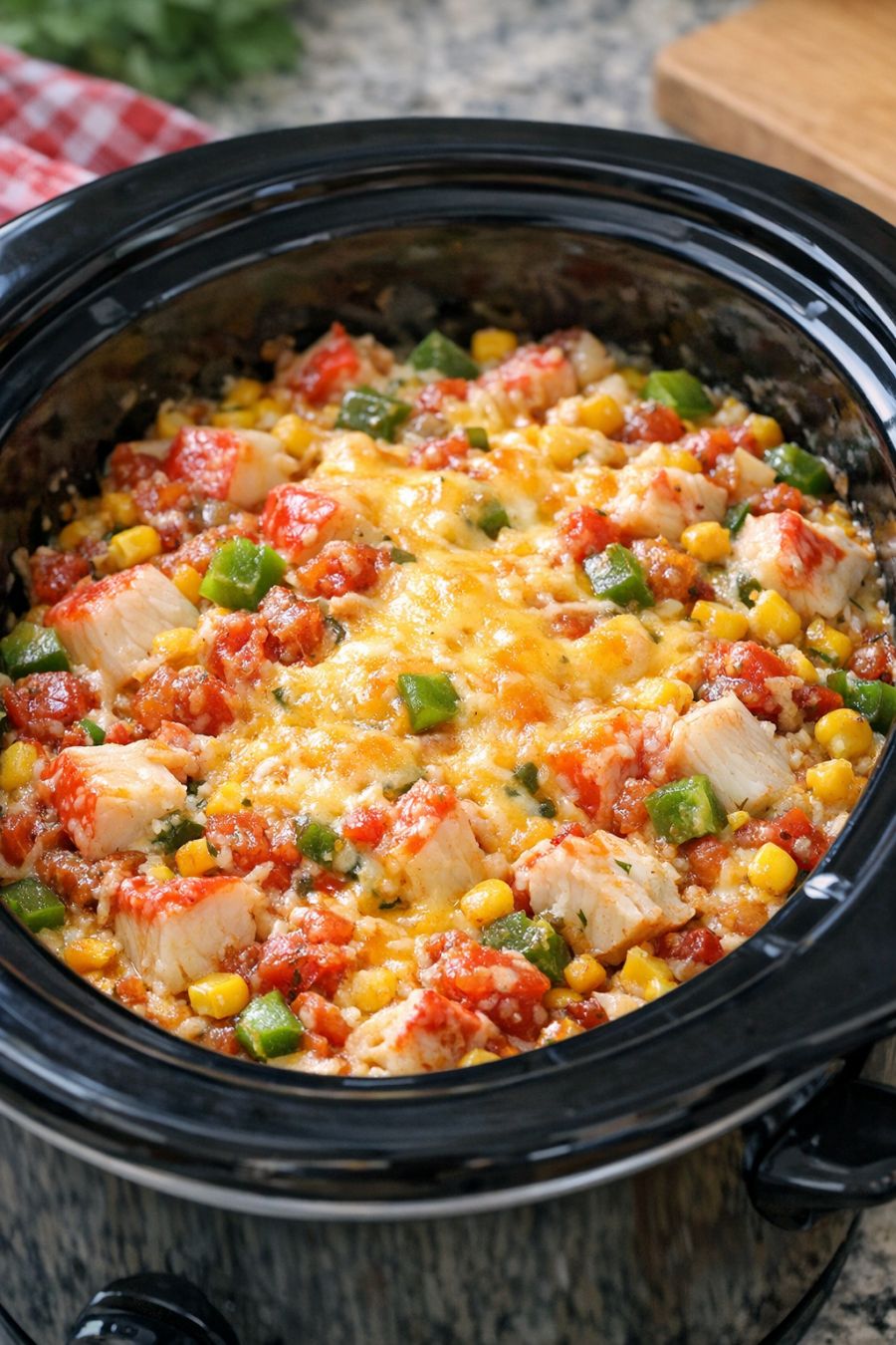 This 5-ingredient slow cooker fiesta crab casserole is one of those “dump it and forget it” dinners that makes busy weeknights feel a little more special. It starts with frozen imitation crab sticks right in the bottom of the crock pot, then gets dressed up with four everyday ingredients you probably already have on hand. A few hours later, you’ve got a creamy, cheesy, Tex-Mex–style casserole that tastes like you fussed, even though you barely lifted a finger. It’s perfect for casual get-togethers, game nights, or nights when you want something a little different that still feels familiar and family-friendly.