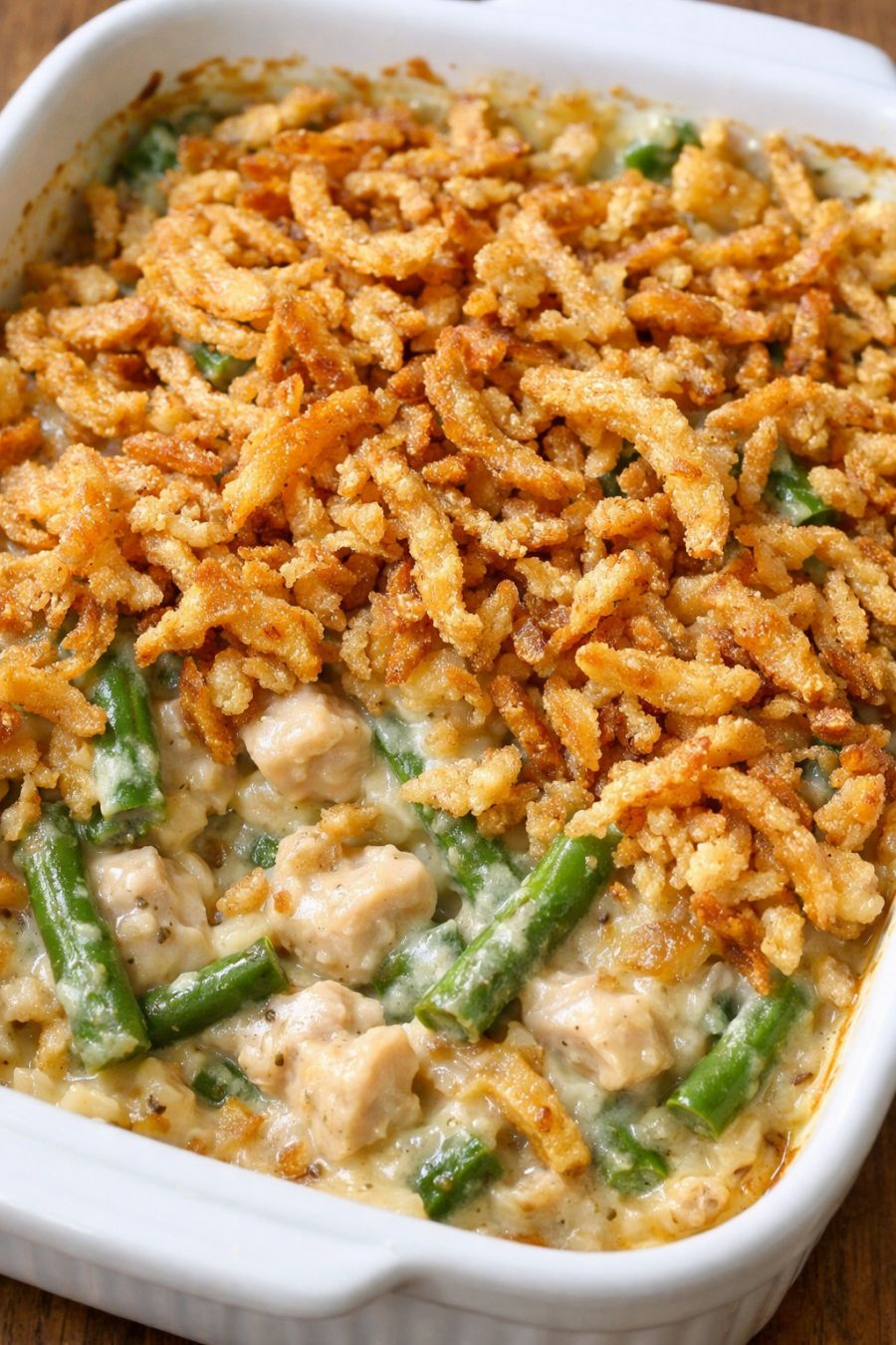 Return the uncovered casserole to the oven and bake for another 10–15 minutes, or until the French fried onions are deep golden and crisp and the chicken reaches an internal temperature of 165°F (74°C) in the thickest pieces.