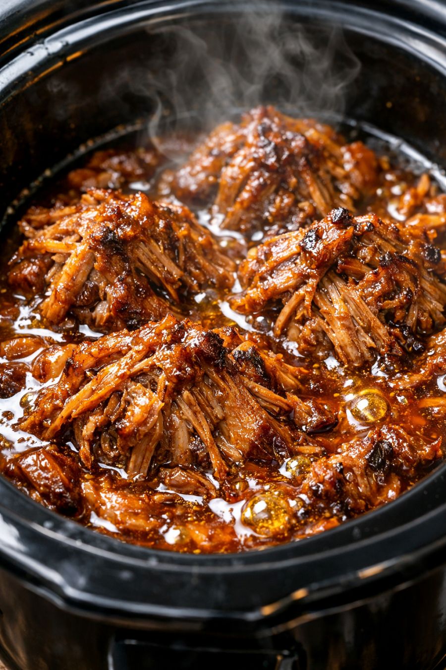 Lift the lid and give everything one last gentle stir, keeping the potatoes in large rustic chunks. Serve hot, straight from the slow cooker, making sure every serving gets plenty of the glossy, bubbling, amber-hued glaze spooned over the top.