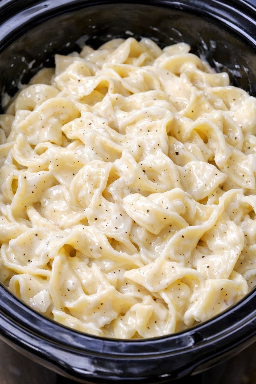 Taste and adjust the seasoning if desired with salt and plenty of freshly cracked black pepper (pepper adds those classic little flecks you see in the sauce). Serve hot, directly from the slow cooker, while the noodles are glossy and creamy.