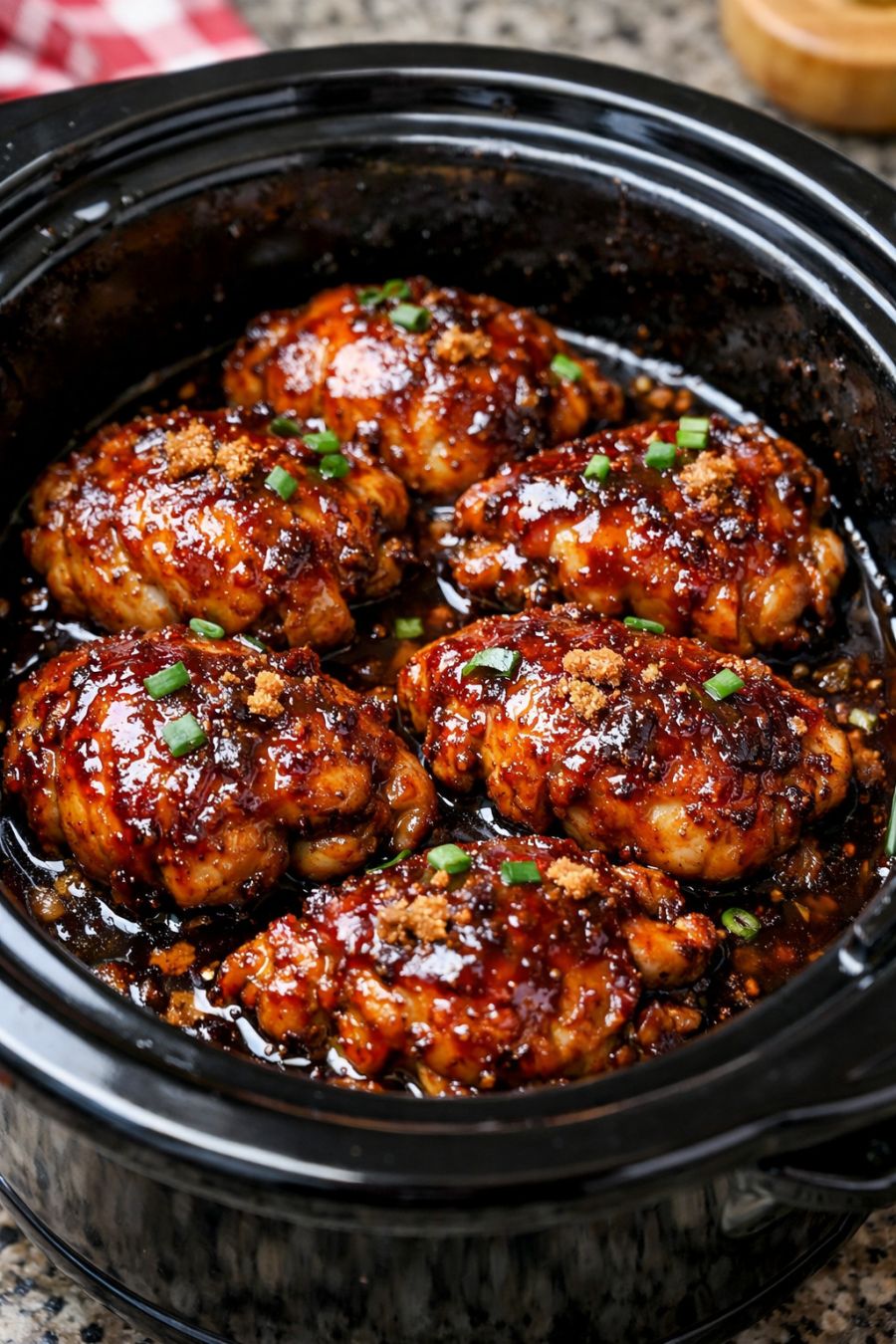 Return the broiled thighs to the slow cooker and gently toss or spoon more sauce over them so they’re completely coated in the sticky glaze. Serve hot, spooning extra caramelized sauce from the pot over each serving.