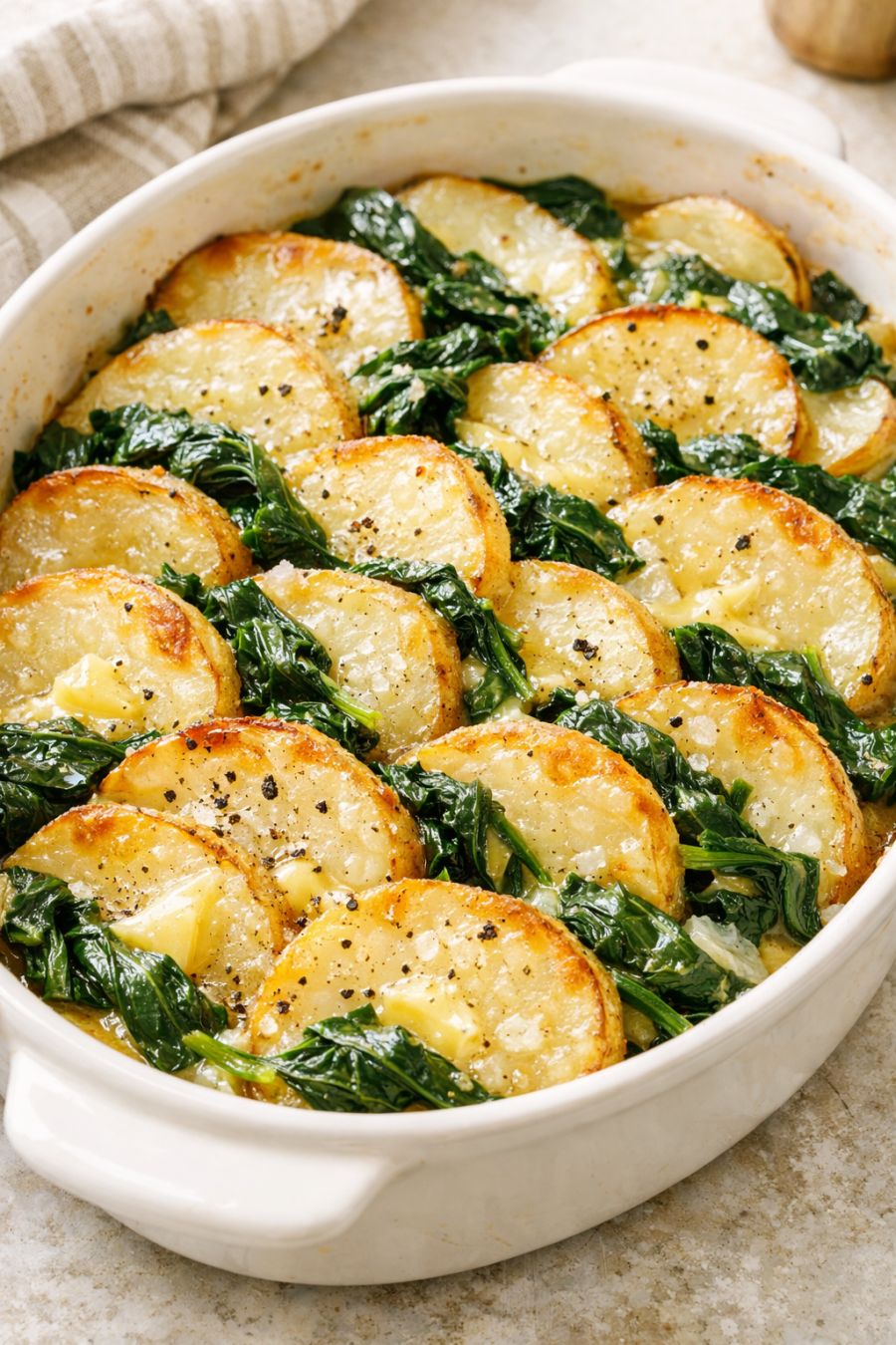 This is my go-to, no-fuss spring side dish: thinly sliced white potatoes layered in a ceramic casserole dish with handfuls of fresh baby spinach scattered over the top, plus just two more pantry ingredients to bring it all together. It’s loosely inspired by simple Amish-style cooking—humble ingredients, oven-baked, and very comforting—but pared down to four ingredients so it fits real weeknight life. I love that I can prep it in about 10 minutes, pop it in the oven, and let it bake while I wrangle work emails or help with homework.