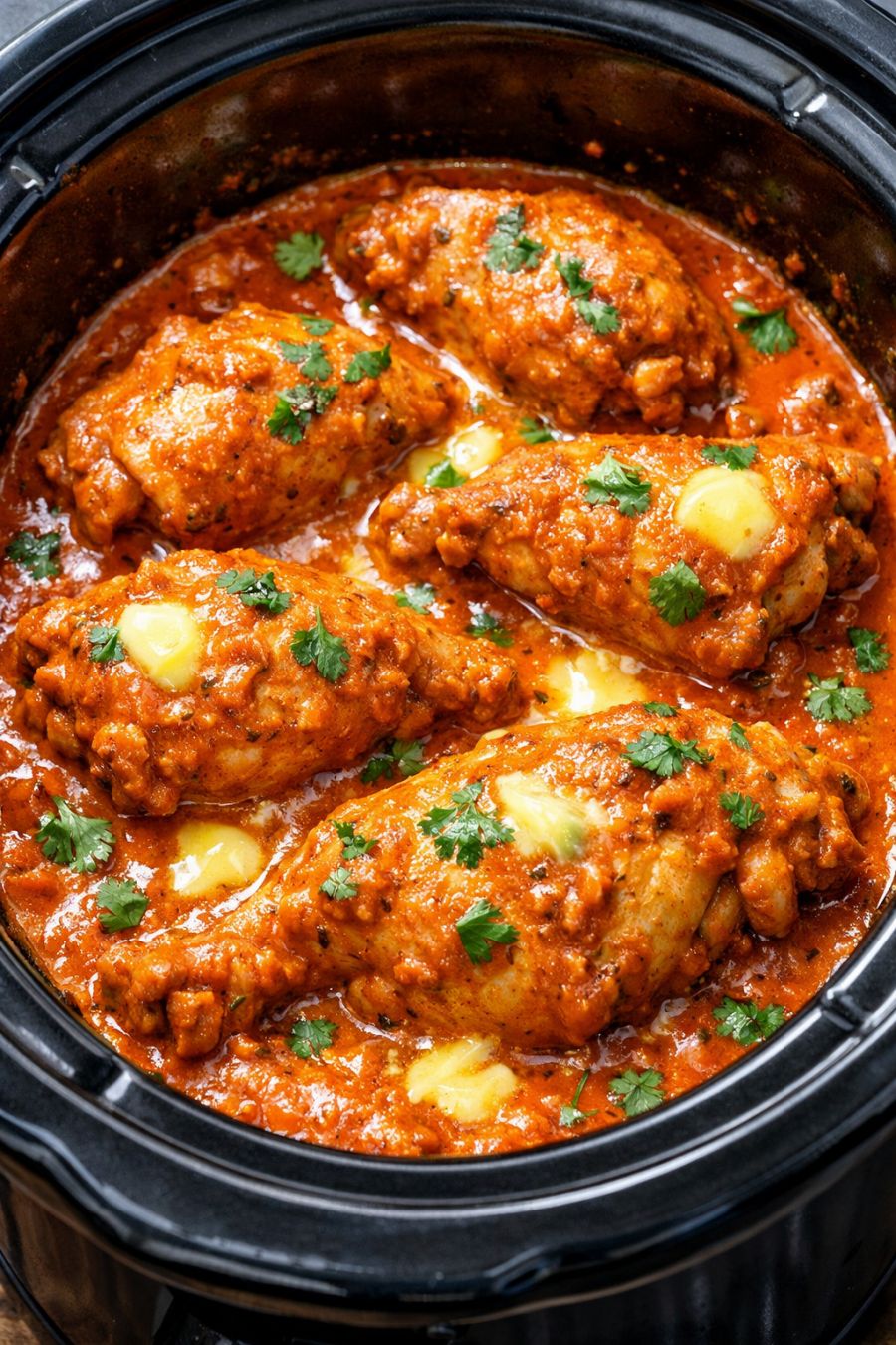 You can easily tailor this Sunday butter chicken to your own kitchen and tastes while keeping it simple. For a slightly lighter version, use half the butter and substitute half-and-half for the heavy cream; the sauce will still be silky, just not as rich. If you’d like a little more of that classic buttery “Indian restaurant” aroma without complicating things, stir 1–2 teaspoons of mild curry powder or garam masala into the tomato sauce before pouring it over the chicken. For a hint of sweetness, add 1–2 tablespoons of honey or brown sugar to the sauce. If your family likes a little heat, a pinch of red pepper flakes or a dash of hot sauce in the sauce will do the trick without making it fiery. You can also use bone-in chicken thighs or leg quarters instead of a whole chicken; reduce the cooking time slightly (usually 4–6 hours on LOW, depending on size) and watch for that same fall-off-the-bone tenderness. Leftovers keep very well—shred the remaining chicken, stir it back into the sauce, and serve over rice or noodles for an easy second meal.