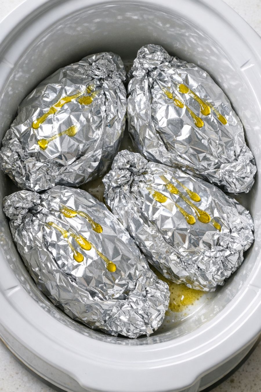 Set the empty, clean slow cooker crock in place. Arrange the foil packets inside the slow cooker, stacking them carefully so they fit snugly but do not tear. It is fine to stack them in layers; just keep them level so juices stay inside each packet.