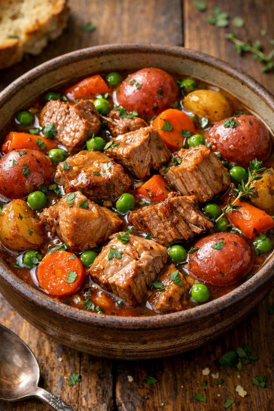 For a touch of extra spring color, you can stir in 1 to 2 cups of fresh or frozen peas during the last 20 minutes of cooking; just pop the lid back on and let them heat through until bright green and tender. If you enjoy a creamier, more gravy-like dish, whisk 2 tablespoons of cornstarch with 2 tablespoons of cold water and stir it into the hot liquid in the slow cooker during the final 30 minutes on HIGH, letting it thicken slightly. A squeeze of fresh lemon at the end will brighten the flavors and give a subtle nod to spring. You can also swap half of the carrots for parsnips, or use small Yukon Gold potatoes instead of red. For a little smoky depth, add 1/2 teaspoon smoked paprika to the broth mixture. If you prefer, boneless pork country-style ribs can stand in for pork shoulder, but keep them cut into similar 1-inch pieces for even cooking. Food safety tips: Always start with fresh, cold pork shoulder and keep it refrigerated until you’re ready to cube it and add it to the slow cooker. Use a clean cutting board and knife reserved for raw meat, and wash them well with hot, soapy water before using them for any other ingredients. Do not brown the pork and then let it sit out; move it directly from prep into the slow cooker. Make sure your slow cooker is set to LOW or HIGH as directed and avoid leaving it on the WARM setting to cook from raw, as that may not bring the pork up to a safe temperature quickly enough. The finished dish should reach an internal temperature of at least 145°F, though with slow-cooked pork shoulder you’ll typically be well above that by the time it’s tender. Refrigerate leftovers within 2 hours of cooking and use them within 3 to 4 days, reheating until steaming hot before serving.