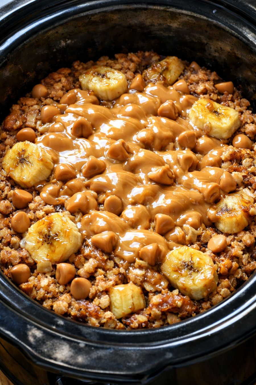 For extra texture, stir 1/4 cup chopped peanuts or mixed nuts into the banana-oat mixture before spreading it over the peanut butter chips. If you prefer things less sweet, reduce the maple syrup to 1/4 cup or use a very ripe fourth banana instead. You can swap maple syrup for honey or agave, keeping in mind that honey should not be given to children under one year old. For a more indulgent version, sprinkle 1/4 cup dark chocolate chips over the peanut butter chips before adding the oat mixture. If you need this to be gluten-free, make sure to use certified gluten-free oats and check that your peanut butter chips are processed in a gluten-free facility. For a dairy-free option, choose dairy-free peanut butter chips. Avoid overcooking; if left too long on HIGH, the sugars can burn on the bottom, so stick to LOW and check around the 2 1/2-hour mark. Always use ripe, unspoiled bananas (no mold, no off smells), and store leftovers in a covered container in the refrigerator for up to 3 days. Reheat portions gently in the microwave until warmed through, and do not leave the cooked dessert sitting at room temperature for more than 2 hours for food safety.