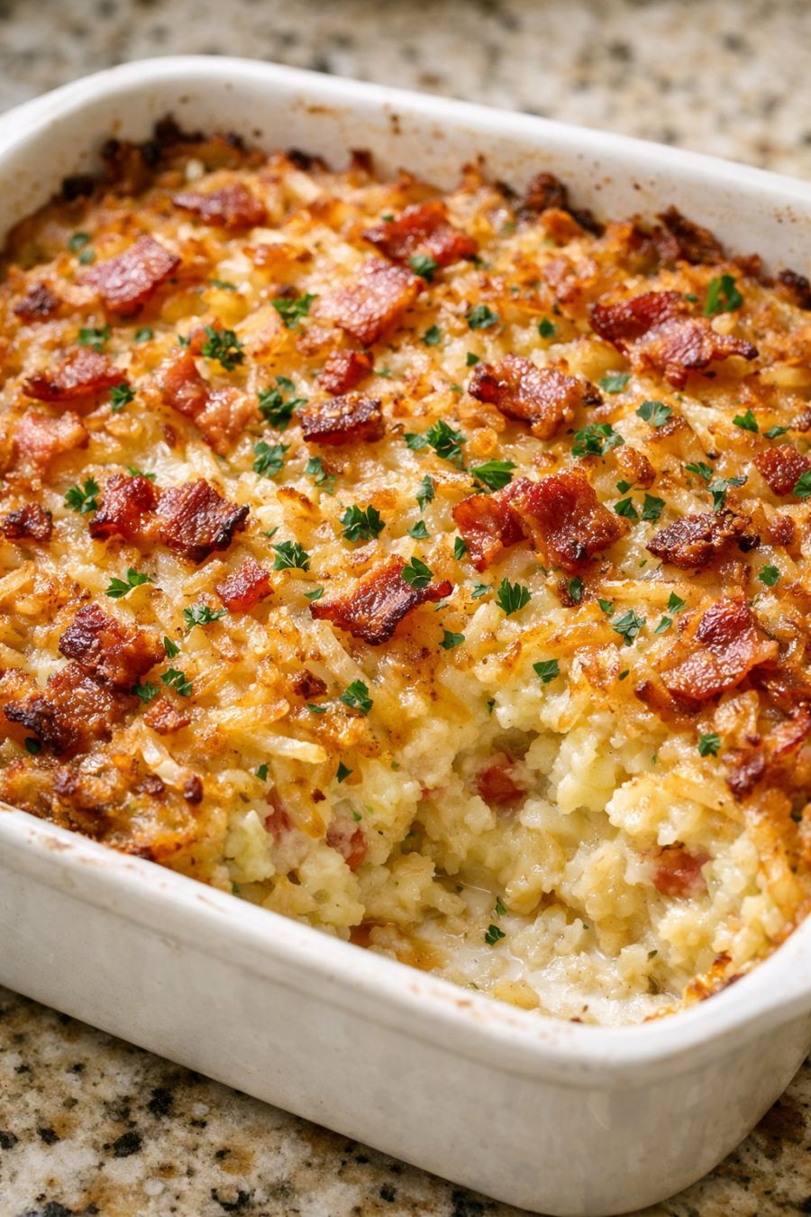 This 5-ingredient oven baked potato casserole using dry dehydrated shredded potatoes is one of those throw-it-together dinners that totally saves a busy weeknight. I started making it on nights when I’d get home from work, realize I hadn’t thawed anything, and needed to turn pantry staples into something that actually felt like a cozy, from-scratch meal. You literally toss the dry shredded potatoes straight in the casserole dish, whisk together four everyday pantry items into a simple dark, savory sauce, pour it over, and bake. It comes out bubbly, creamy, and deeply flavorful—like a cross between hash browns and a loaded baked potato casserole—without a ton of chopping or dishes.