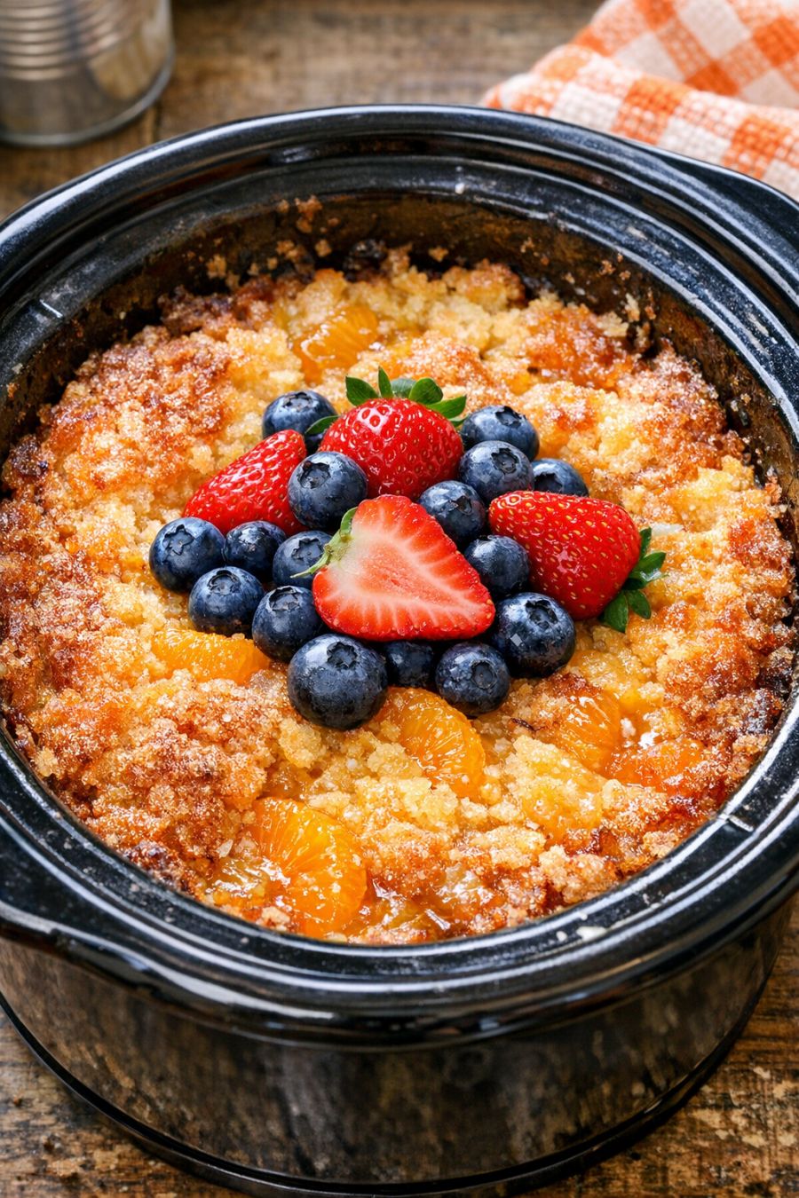 For picky eaters, you can mash the oranges slightly with a spoon before adding the cake mix so there are fewer big fruit pieces—they’ll still get the flavor without noticing the texture as much. If you’d like a little extra flavor, sprinkle 1/2 teaspoon of ground cinnamon or a teaspoon of vanilla extract over the oranges before adding the cake mix (this technically adds ingredients, but they’re optional flavor boosts). You can also swap the yellow cake mix for white cake mix or even a lemon cake mix for a brighter citrus punch. If your slow cooker tends to run hot, check the dessert about 30 minutes earlier than the time listed so the edges don’t overcook; every slow cooker is a bit different. For a slightly lighter version, you can use a reduced-sugar cake mix if available, and serve with plain Greek yogurt instead of ice cream. Food safety tips: Always make sure your canned mandarin oranges are not expired, the cans are not bulging or damaged, and the fruit smells fresh when opened. Keep the slow cooker covered while cooking so the temperature stays consistent. Once cooked, refrigerate leftovers within 2 hours in a shallow, covered container, and enjoy within 3–4 days. Reheat portions gently in the microwave until steaming hot before serving again.