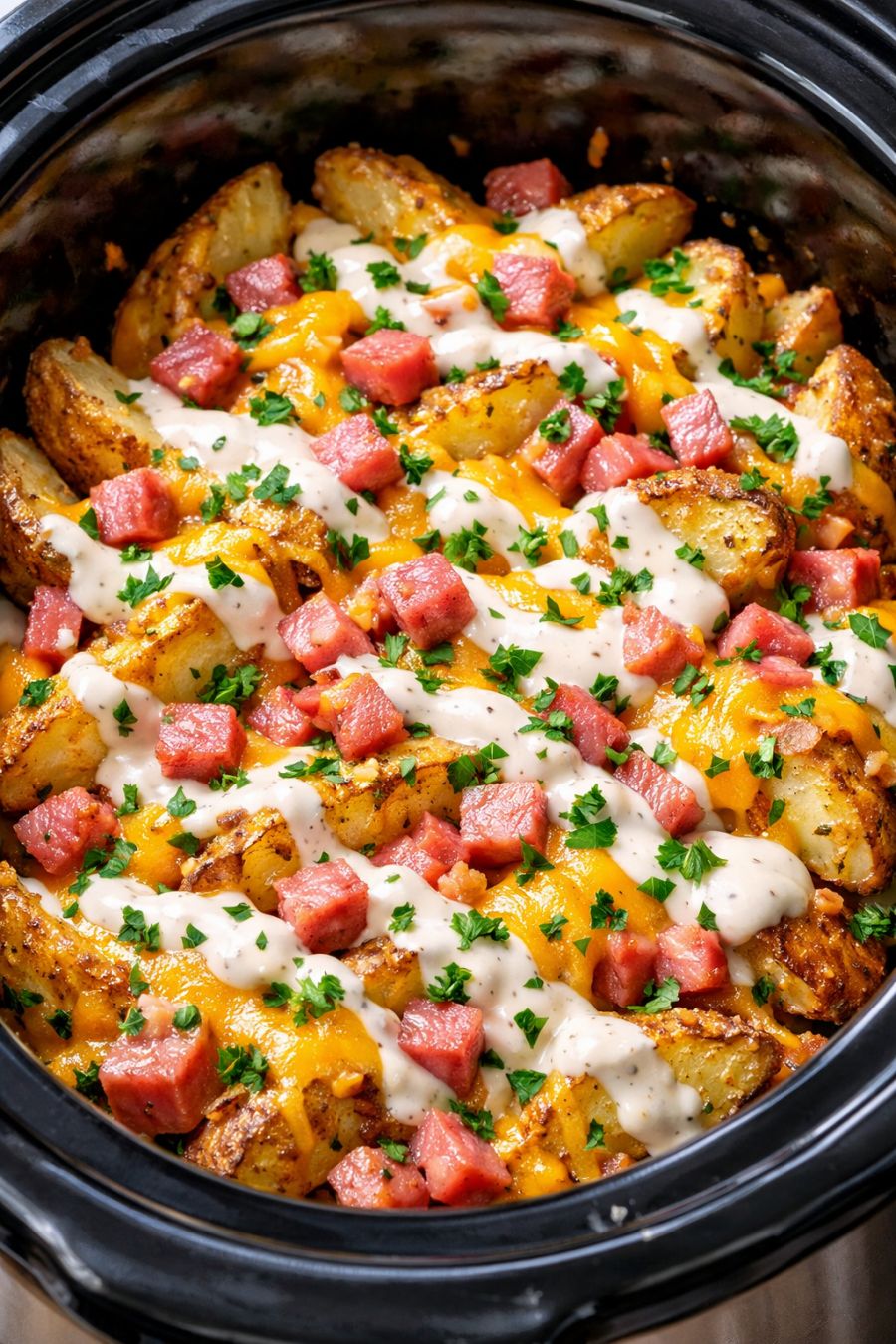 For picky eaters, you can swap the seasoned potato wedges for plain frozen wedges if you prefer a milder flavor. If someone doesn’t like ham, use cooked crumbled bacon, sliced smoked sausage, or even leftover shredded rotisserie chicken instead—just keep the total amount around 1 cup so the dish doesn’t get too crowded. To make it a bit lighter, use a reduced-fat condensed soup and 2% cheese; it will still be creamy, just a little less rich. If you need to keep it meatless, skip the ham and add a handful of frozen peas or corn during the last 30–45 minutes of cooking for a simple vegetarian side (just be sure your condensed soup is vegetarian if that’s important to you). For a little extra color and a “spring sunset” look, sprinkle chopped fresh parsley or sliced green onions over the top right before serving. Food safety tips: Always keep the frozen potato wedges frozen until you’re ready to add them to the slow cooker; do not thaw on the counter. Make sure any ham or sausage you use is fully cooked and kept refrigerated until it goes into the slow cooker. Cook on LOW or HIGH as directed and avoid leaving the slow cooker on the WARM setting for more than 2–3 hours after cooking to keep the potatoes and dairy at a safe temperature. Refrigerate leftovers within 2 hours in a shallow container, and reheat thoroughly until steaming hot before serving again.