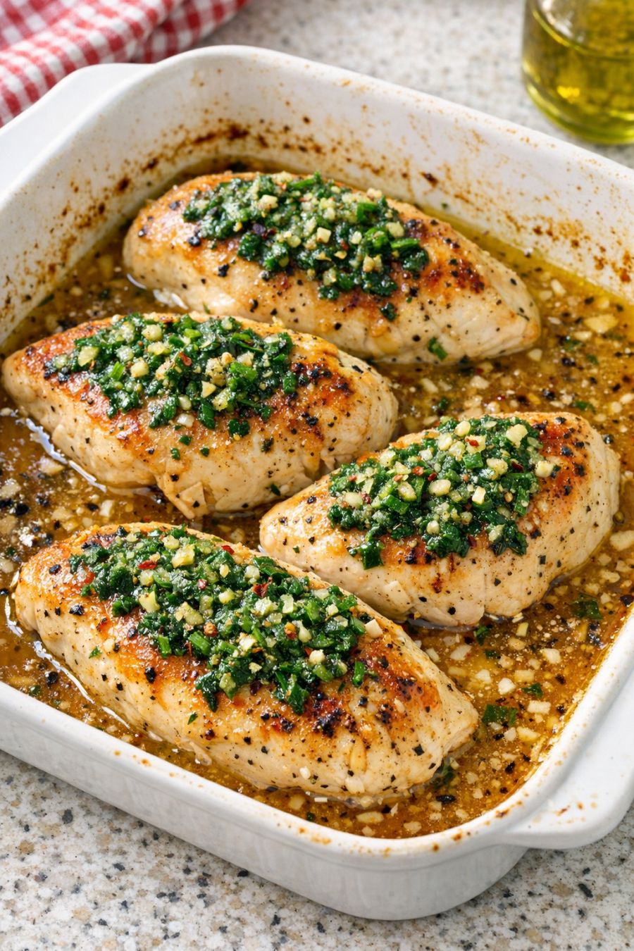 Once the chicken is done, let it rest in the dish for 5 to 10 minutes. This helps the juices settle and slightly thickens the sauce. Spoon the flavorful liquid over the chicken when serving, and taste the sauce to see if you’d like an extra pinch of salt or pepper.