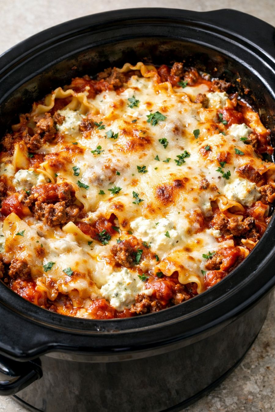 Once cooked, turn off the slow cooker and let the lasagna rest, covered, for about 15 to 20 minutes. This helps it set up so it’s easier to scoop and serve without falling apart.