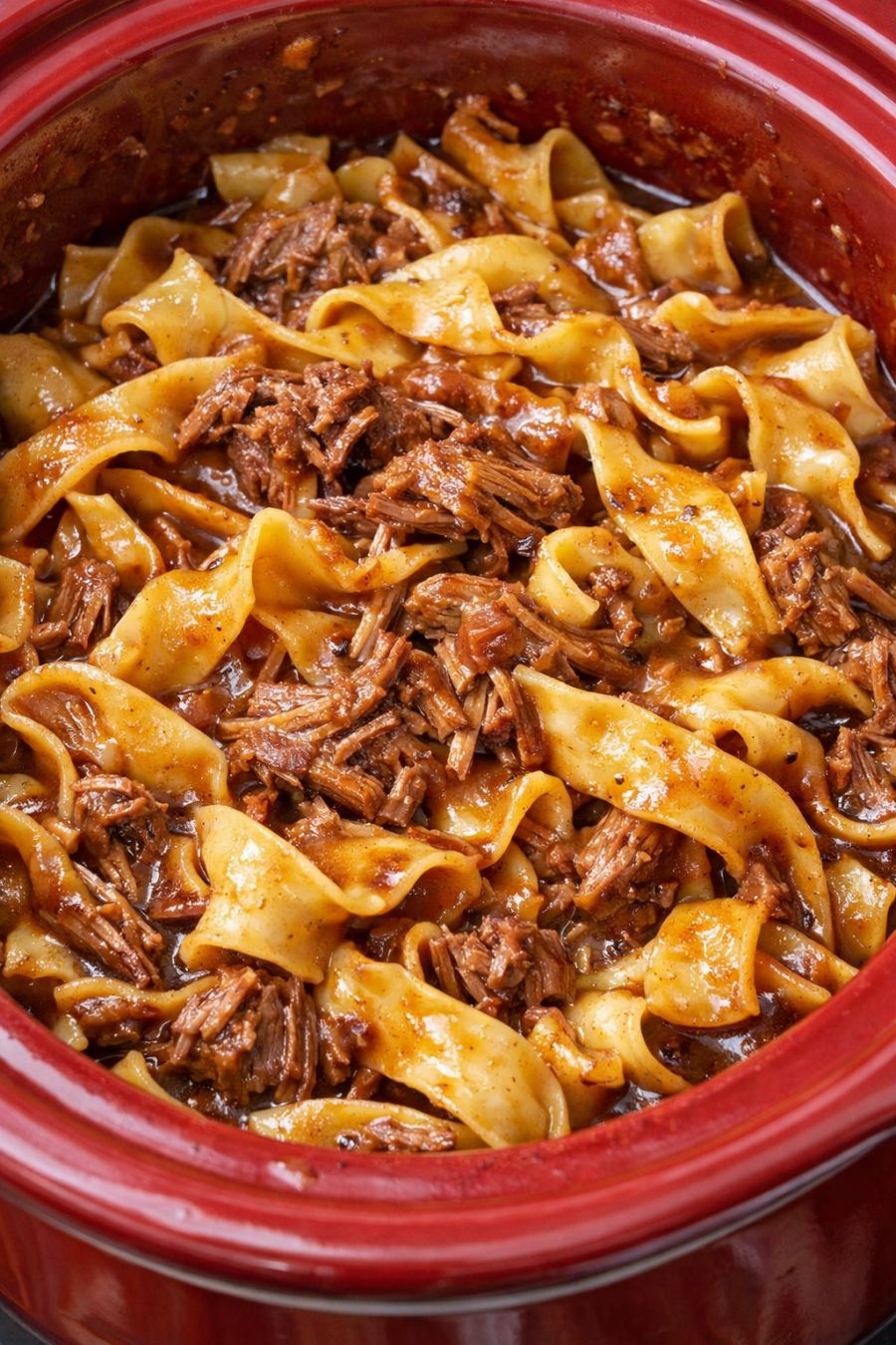 About 30 minutes before serving, stir the mixture well, breaking up the beef into smaller shreds and chunks if needed. Add the uncooked wide egg noodles directly to the slow cooker, scattering them over the surface rather than dumping in one pile so they have a better chance to cook evenly.