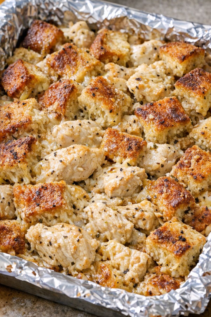 Sprinkle the seasoned croutons evenly over the top of the chicken and sauce, covering the pan from edge to edge. Lightly press the croutons down with your hands so they stick into the creamy mixture but still sit mostly on top to form a golden crust.