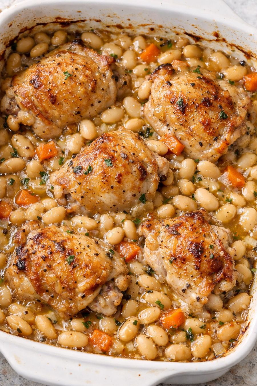 Let the casserole rest for 5–10 minutes before serving so the bubbling sauce settles slightly. Serve the chicken pieces with plenty of the creamy white beans and pan sauce spooned over the top.