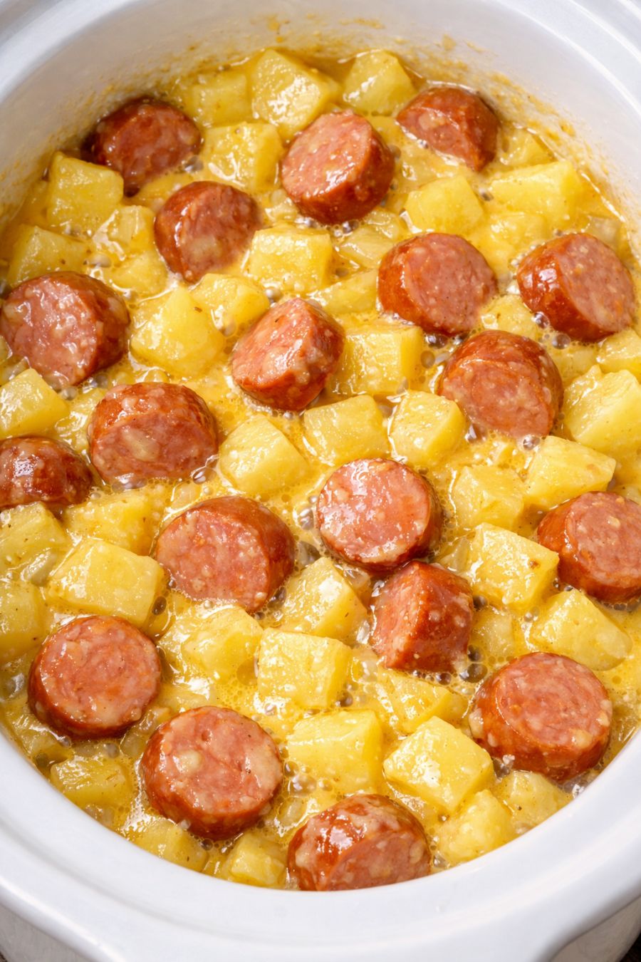 Once cooked, gently stir everything together in the slow cooker so the hot dog rounds and potato cubes are evenly coated in the creamy yellow cheese sauce. Taste and, if desired, season lightly with salt and black pepper, keeping in mind that the hot dogs and cheese soup are already salty.