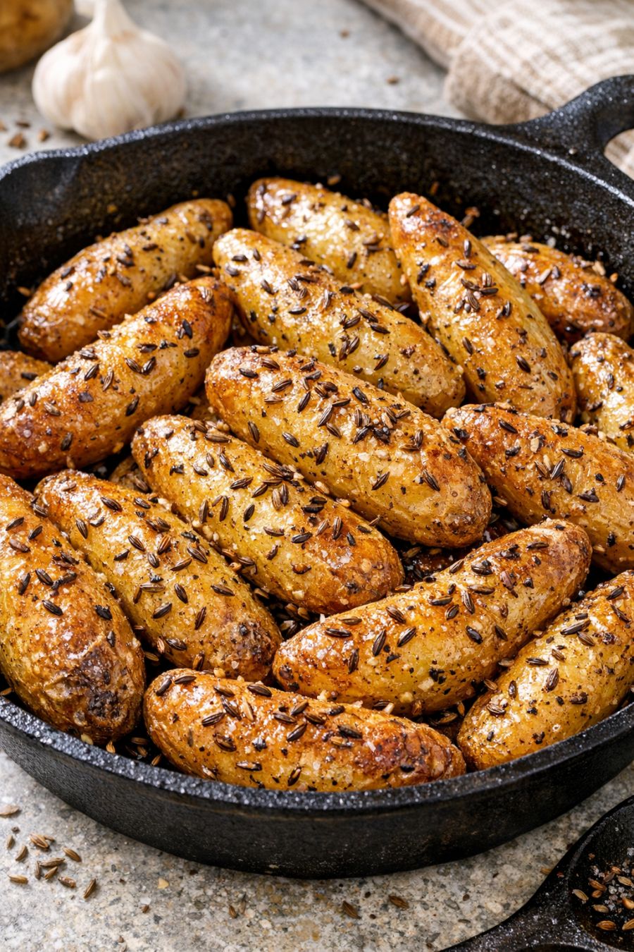 For a richer finish, toss the hot, roasted potatoes with a small knob of butter just before serving; it will melt into the caraway and create a glossy coating. If you enjoy more pronounced caraway flavor, lightly crush some of the seeds with a mortar and pestle before sprinkling them over the potatoes so they release more aroma. You can also add a scattering of chopped fresh parsley, chives, or dill after baking for a bit of color and freshness without changing the core three-ingredient character of the dish. To lean into Eastern European flavors, serve the potatoes with a spoonful of sour cream and a few thinly sliced scallions on top. Food-safety and handling tips: Always preheat the oven fully before roasting so the potatoes cook through safely and evenly. Use a dry kitchen towel or oven mitts when handling the cast iron—its handle stays hot long after leaving the oven. Scrub the potatoes well, especially if you’re leaving the skins on, to remove any grit. Leftover potatoes should be cooled quickly, then refrigerated within 2 hours in a shallow container; reheat thoroughly in a hot skillet or oven until steaming before serving.