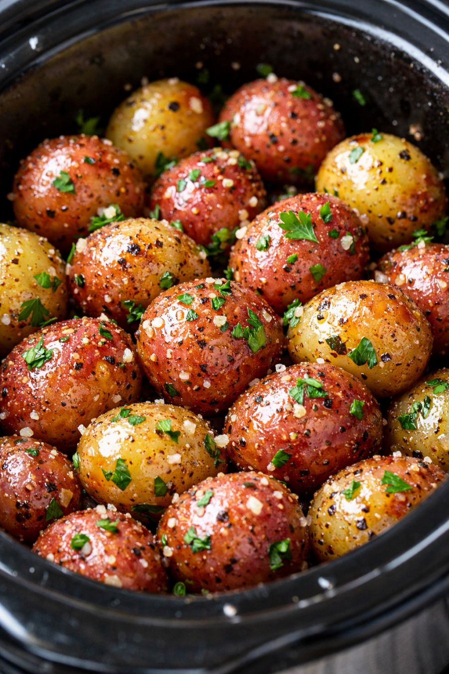 Serve these tender, buttery baby reds straight from the slow cooker with roasted or grilled chicken, pork chops, or a simple meatloaf. They’re also lovely alongside ham, green beans, and a crisp salad for a full Sunday-style supper. Spoon some of the garlicky, herbed butter from the bottom of the crock over the potatoes right at the table. If you like, add a basket of warm dinner rolls to soak up the extra juices, and a light dessert like fruit salad or pudding to finish the meal without feeling too heavy.