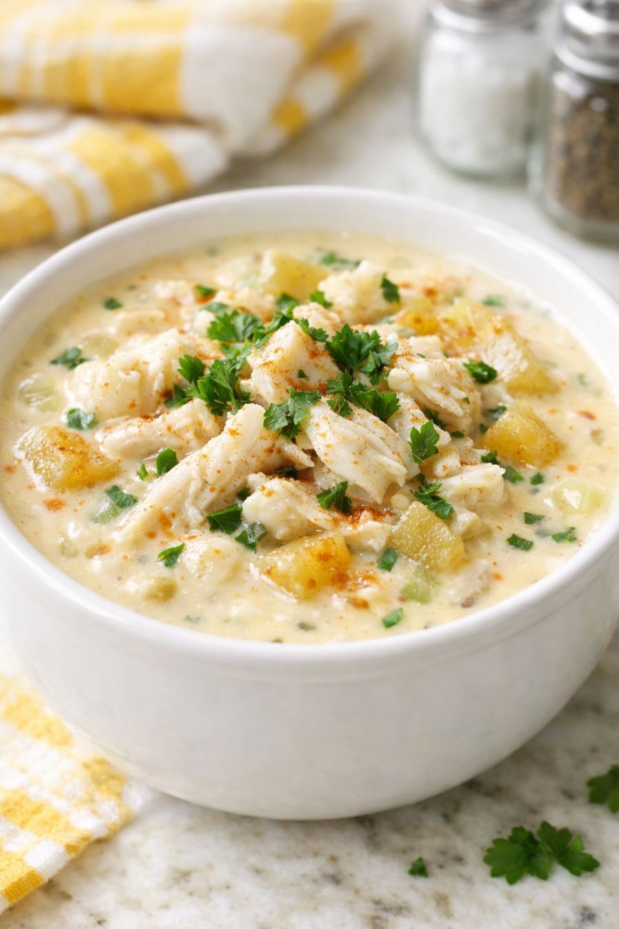 Ladle the hot crab chowder into bowls and serve immediately. If you like, garnish with a sprinkle of paprika, chopped fresh parsley, or a squeeze of lemon at the table (all optional and not counted among the core four ingredients).