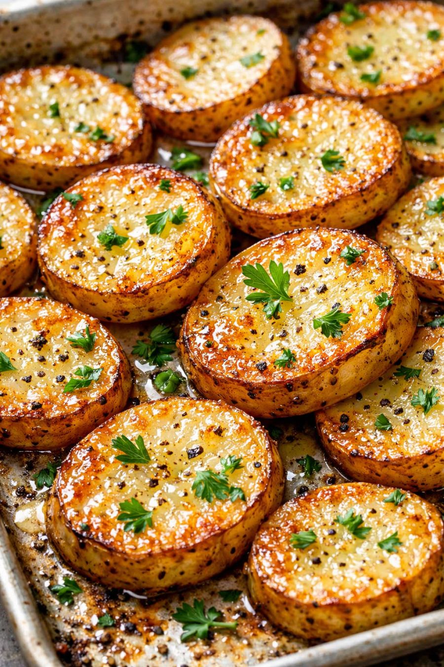 Drizzle the butter mixture evenly over the potatoes, then gently toss or turn the slices with a spatula so they’re all lightly coated. Spread them back out into a mostly even layer.