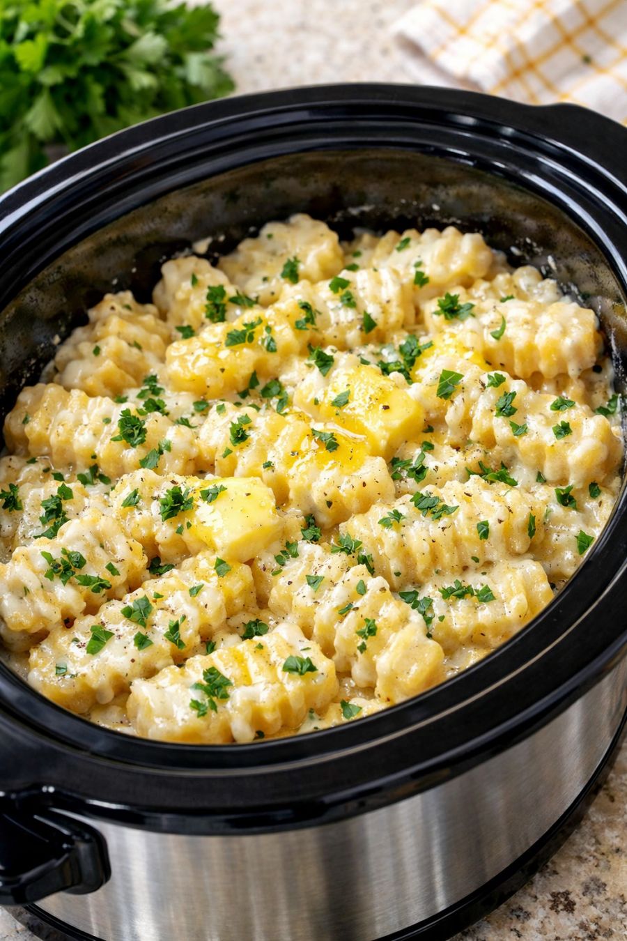 Food safety tips: Always start with frozen potatoes straight from the freezer; do not let them sit at room temperature for long before cooking. Keep the slow cooker covered while cooking so the temperature stays in a safe range. Use a food thermometer if you like—potatoes and sauce should reach at least 165°F in the center before serving. Promptly refrigerate leftovers in a shallow container within 2 hours of serving, and use within 3–4 days. Reheat leftovers thoroughly until steaming hot before eating, and do not reheat more than once.