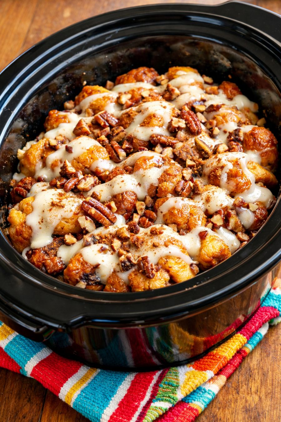 Cover the slow cooker with the lid. Cook on LOW for 2 1/2 to 3 hours, or until the cinnamon roll pieces are puffed, cooked through in the center, and the edges are bubbly and lightly browned. Avoid lifting the lid during the first 2 hours so the heat stays consistent.