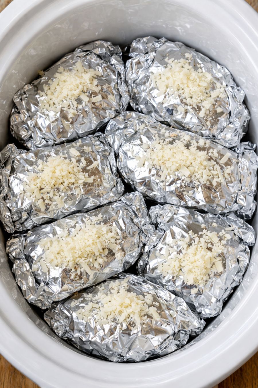 Arrange in the slow cooker: Place the foil packets seam-side up in the slow cooker crock, packing them in tightly so they stand upright and don’t tip. It is fine if they are slightly squished together; that helps them cook evenly. Cover the slow cooker with its lid.