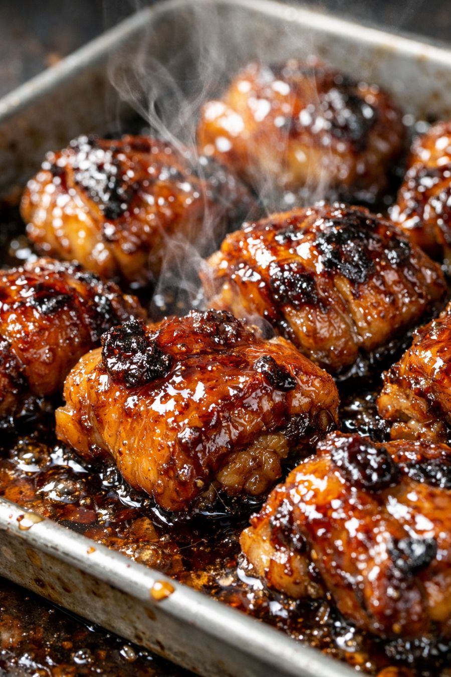 Serve the chicken thighs straight from the metal baking sheet, spooning the dark, glossy pan sauce over each piece. I like them over plain steamed rice or buttery mashed potatoes to soak up every drop of rendered fat and glaze. A quick side of roasted carrots, sautéed green beans, or a simple green salad with a sharp vinaigrette balances the richness. If you’re leaning casual, tuck the morsels into warm rice bowls with sliced cucumbers and scallions; for something a bit more special, pair with a crisp white wine or chilled lager and a side of garlicky sautéed greens.