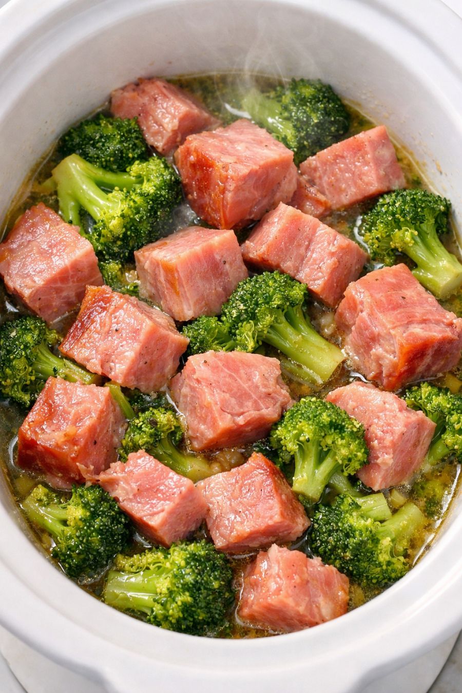 Once everything is tender and steaming, give the contents a gentle stir from the bottom to distribute the buttery broth. Serve the ham and broccoli hot, ladling some of the rich cooking liquid over each portion.
