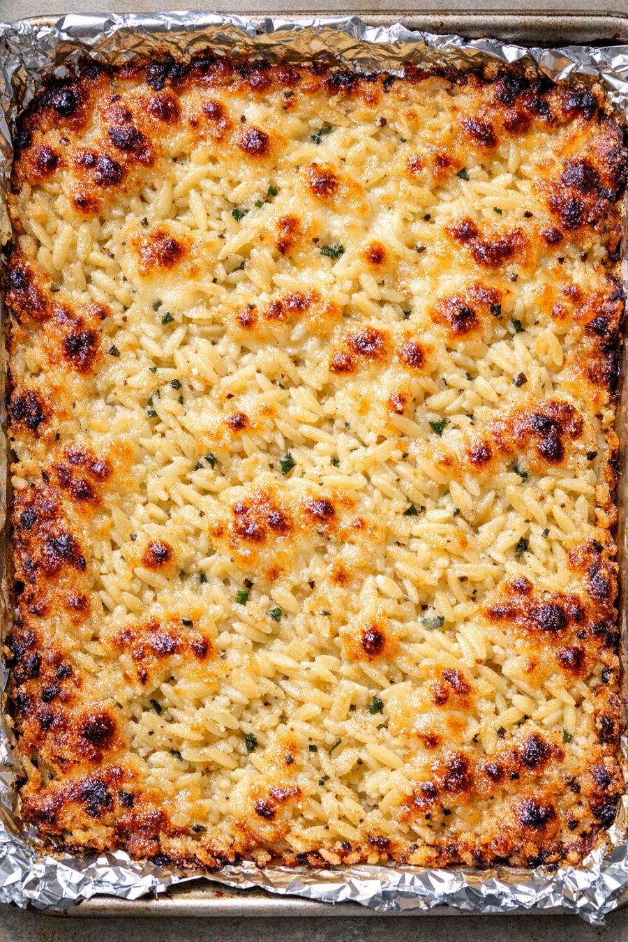 Oven-Baked 4-Ingredient Sheet Pan Garlic Parmesan Orzo