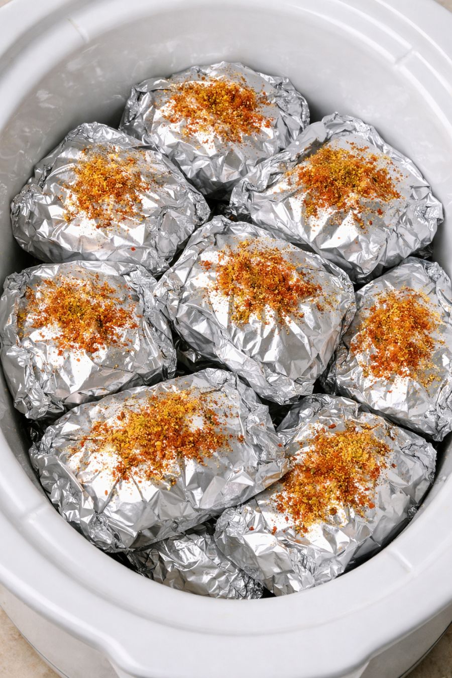 Set your slow cooker on the counter. Arrange the foil packets inside the crock standing on their sides or slightly angled, stacking them like bricks so they fit snugly together. It’s fine if they’re packed in tightly; that helps them cook evenly.
