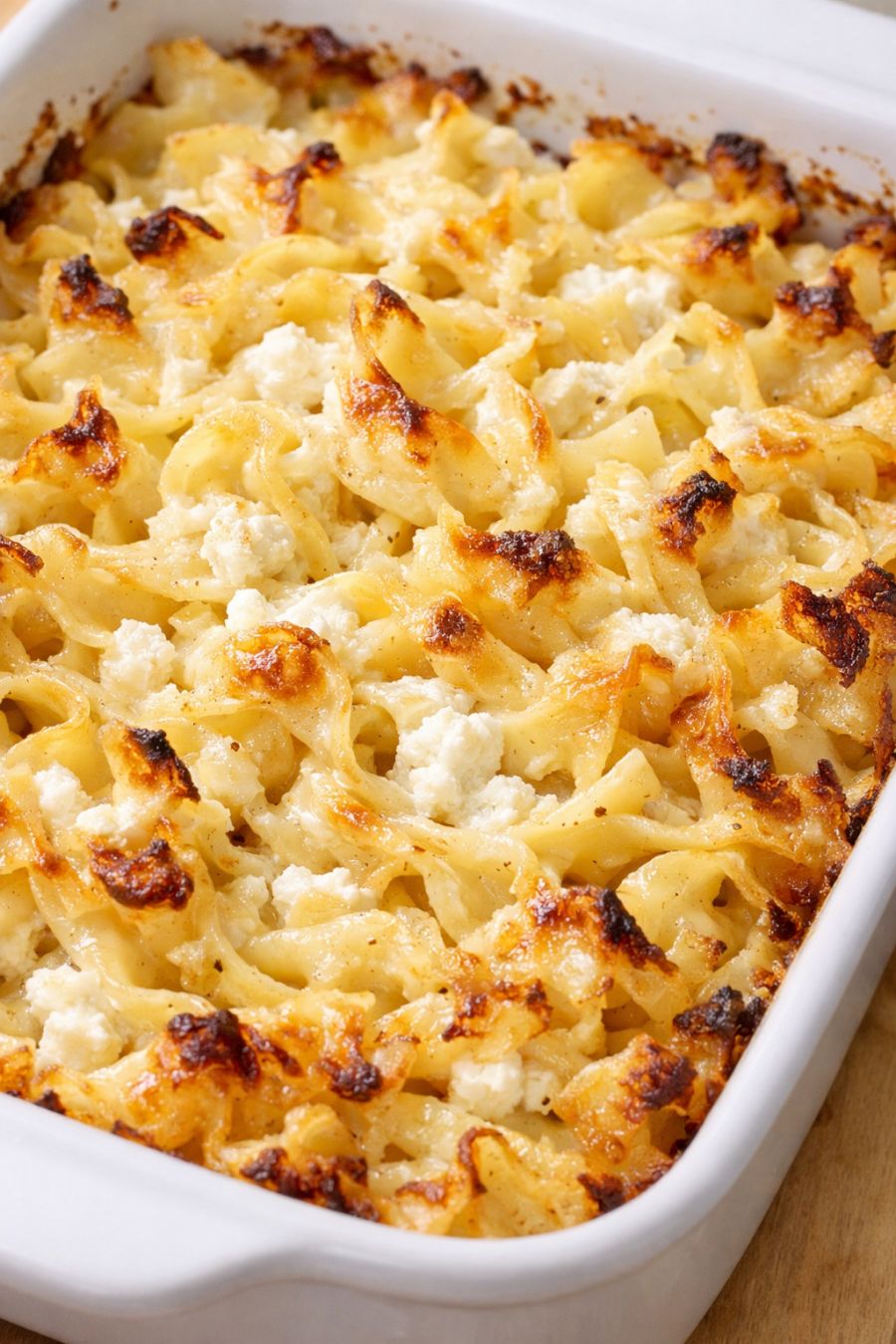 This oven baked 4-ingredient farmers cheese and egg noodle bake is one of those humble, Midwestern comfort dishes that somehow steals the show every time. My grandma made a version of this for every holiday and potluck—wide egg noodles, tangy farmers cheese, rich dairy, and just enough butter to crisp the edges. As it bakes, the noodles soak up the creamy mixture and the top turns golden and slightly chewy around the edges. It’s simple, economical, and deeply nostalgic, yet the texture is so incredibly creamy you’d never guess it came from only four ingredients.