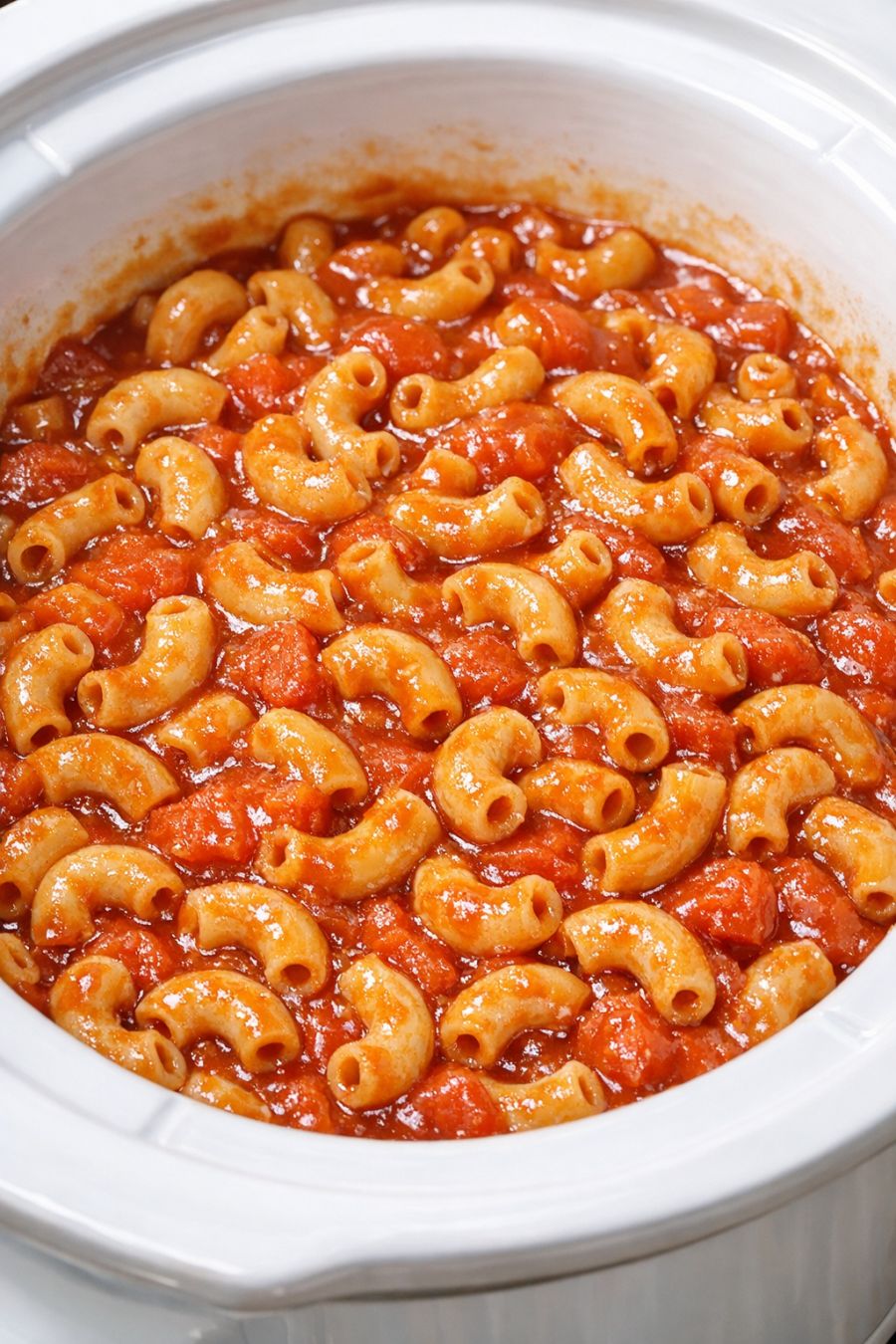 Continue cooking on HIGH for another 30 to 45 minutes, stirring every 15 minutes. The macaroni is done when it is soft and tender, and most of the tomato juice has reduced into a thick, glossy, bright red sauce that clings to the noodles. Total pasta cook time is usually 1 hour to 1 hour 15 minutes, depending on your slow cooker.
