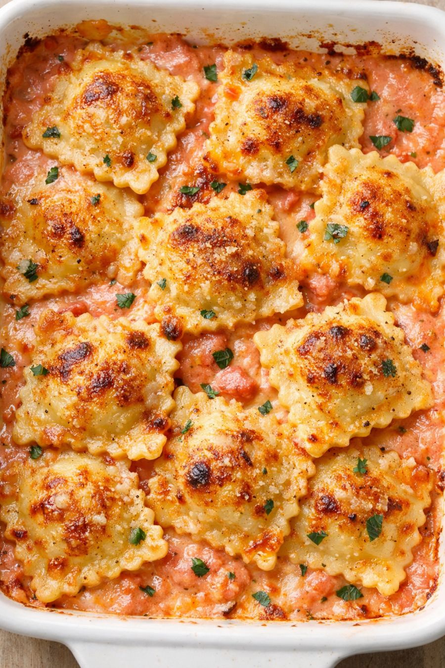 For an extra golden crust, you can broil the top on high for 1–2 minutes at the end, watching closely so it doesn’t burn. When done, remove the dish from the oven and let the ravioli rest for about 5 minutes so the sauce thickens slightly and the ravioli finish setting.