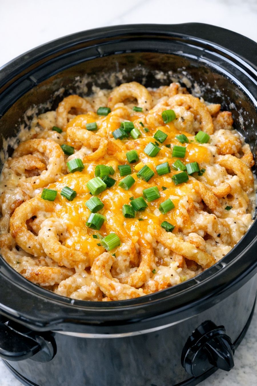 Cover the slow cooker with the lid and cook on LOW for 4 to 5 hours, or on HIGH for 2 to 2 1/2 hours, until the curly fries are very tender and the edges are bubbling. Avoid lifting the lid during the first couple of hours so the heat stays in.