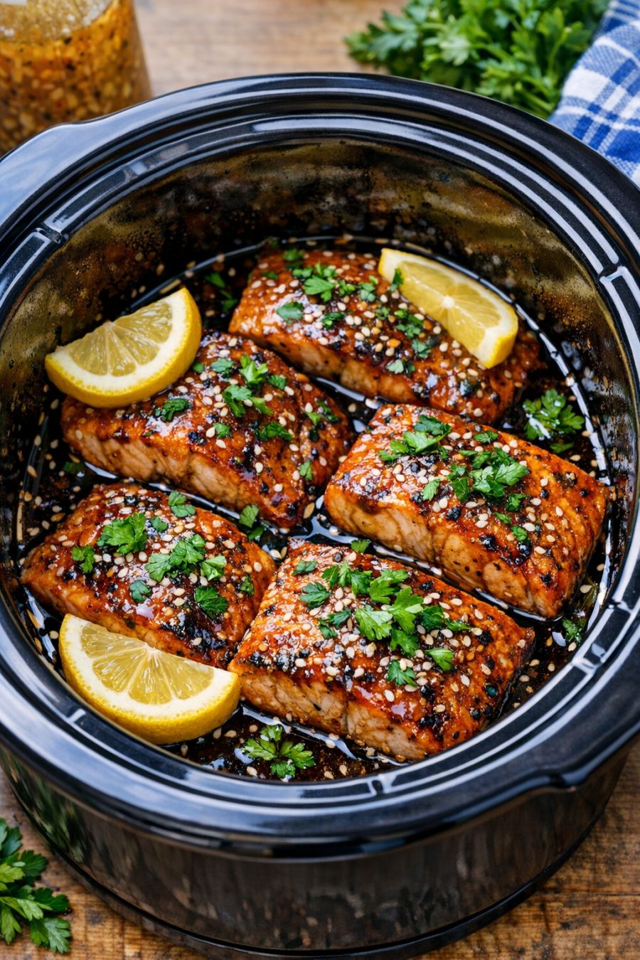 Once cooked, carefully lift the salmon fillets from the slow cooker with a wide spatula, as they will be very delicate. Spoon some of the dark, savory cooking juices over each portion when serving.