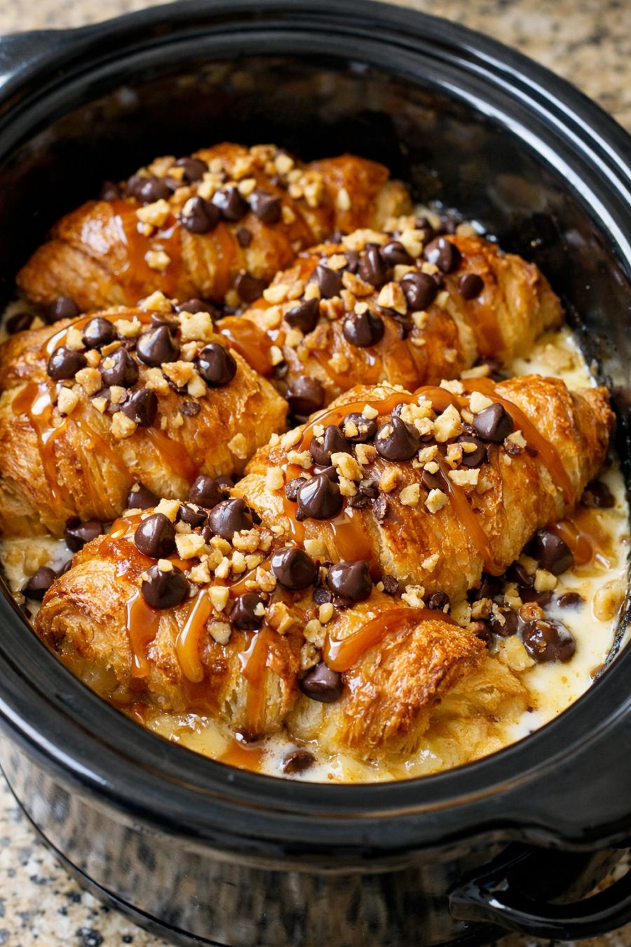 Spoon the warm croissants and custard into bowls, making sure everyone gets some of the chocolate and creamy sauce from the bottom of the slow cooker. Serve right away.