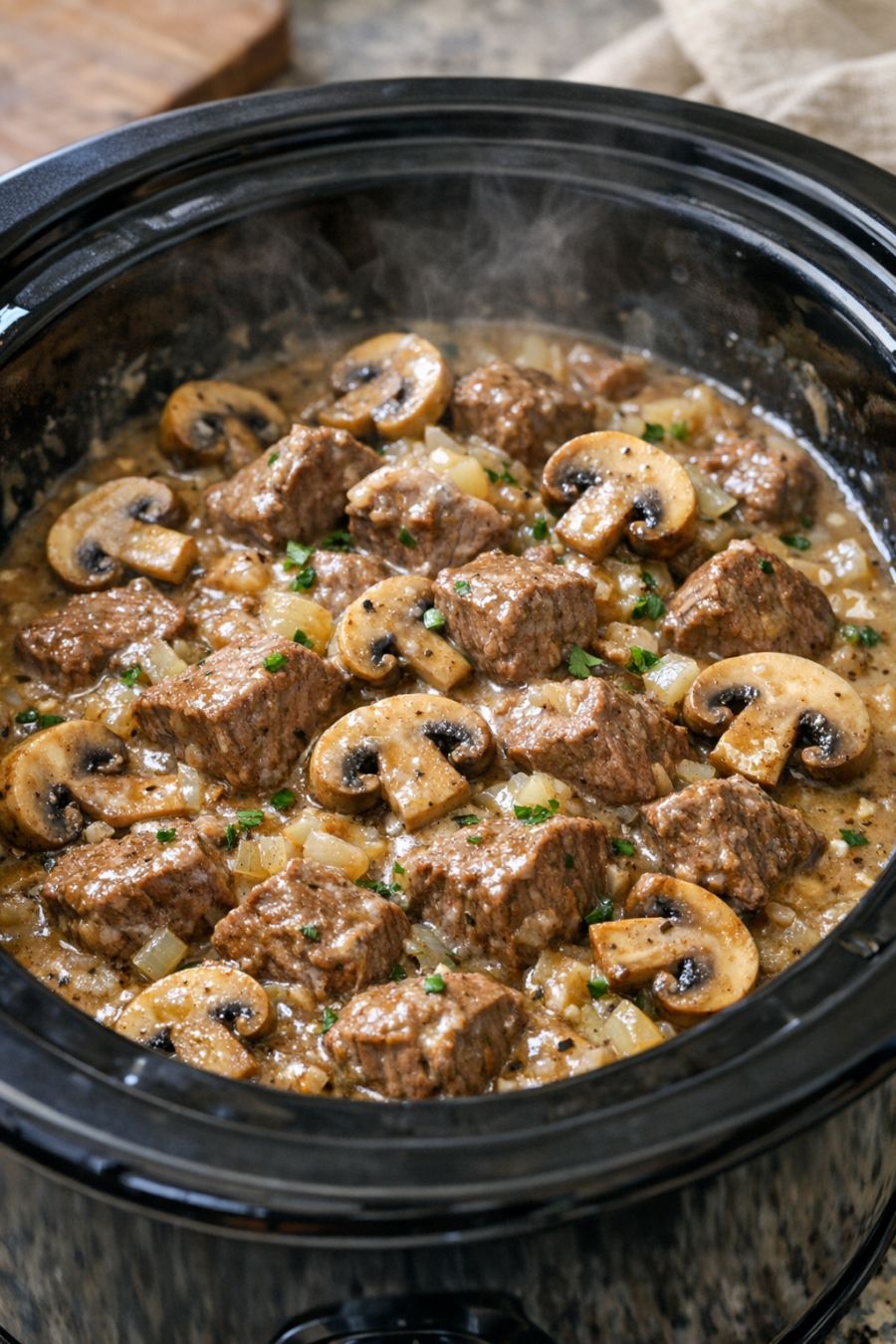 For a creamier gravy, stir in 1/4 to 1/2 cup sour cream or plain Greek yogurt at the very end of cooking, with the heat turned to WARM so it doesn’t curdle. You can also add a splash of milk or cream if the gravy is thicker than you like. If you prefer a deeper beef flavor, use beef broth instead of water and add 1 teaspoon Worcestershire sauce to the soup mixture. For a little extra earthiness, mix in a handful of sliced onions with the mushrooms before cooking. If you don’t have cubed steak, thinly sliced round steak or blade steak can work, but they may need the full cooking time on LOW to get tender.