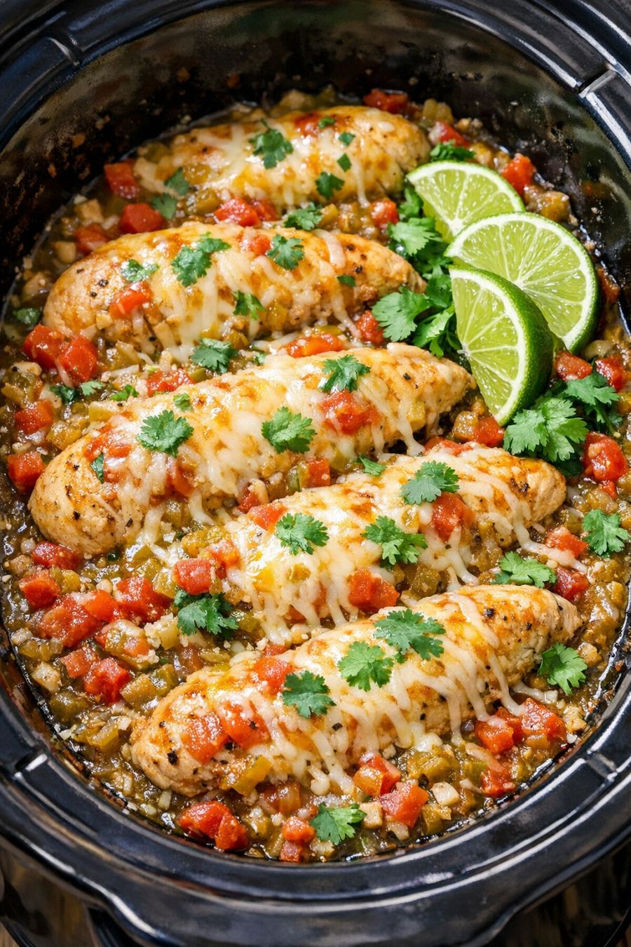 Once cooked, use two forks to shred the chicken directly in the slow cooker, mixing it into the surrounding sauce until everything is evenly coated and juicy. Taste and adjust seasoning if needed, adding a pinch of salt or an extra splash of salsa verde if you’d like more brightness.